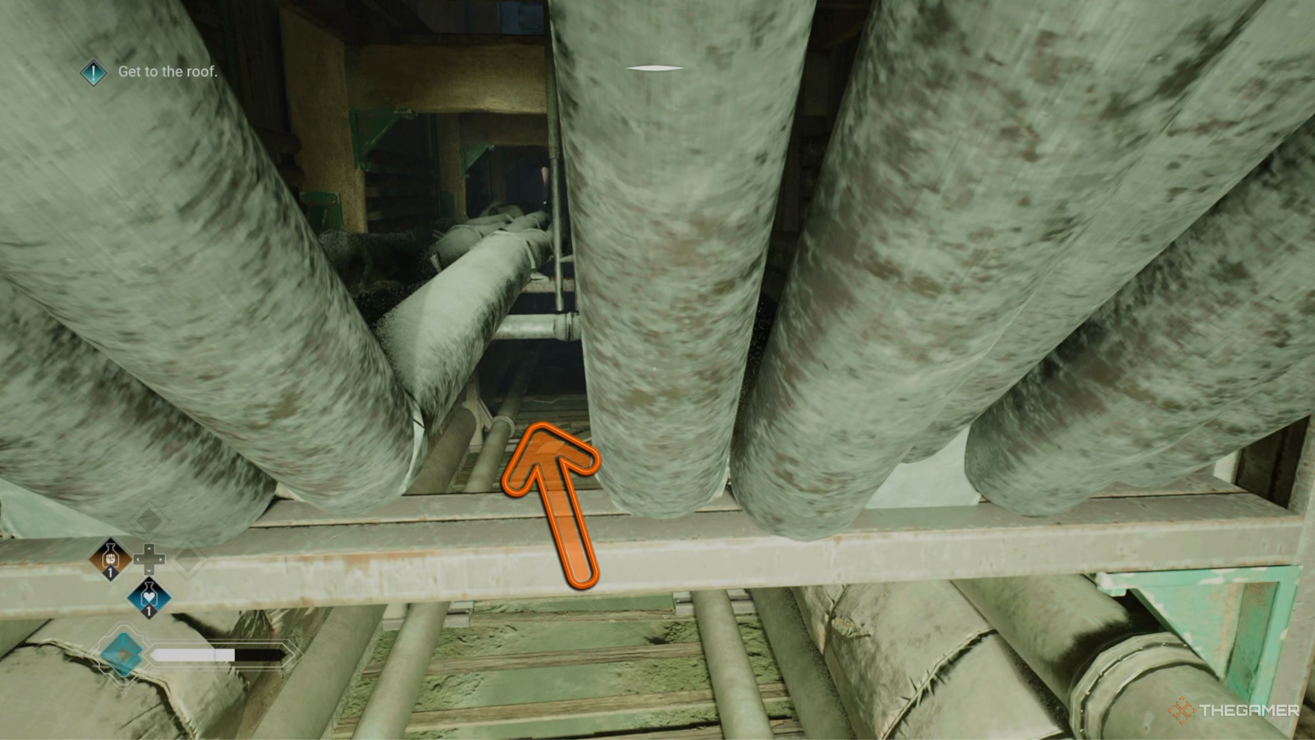 Используйте свои телекинетические способности на трубе – это заставит лифт упасть и создаст отверстие слева от него. Войдите в лифтовую шахту и прыгните на сам лифт. Это позволит вам подняться по лестнице, чтобы достичь более высокого уровня. Оттуда следуйте по коридорам, пока не достигнете большой открытой зоны с небольшим деревянным мостом.