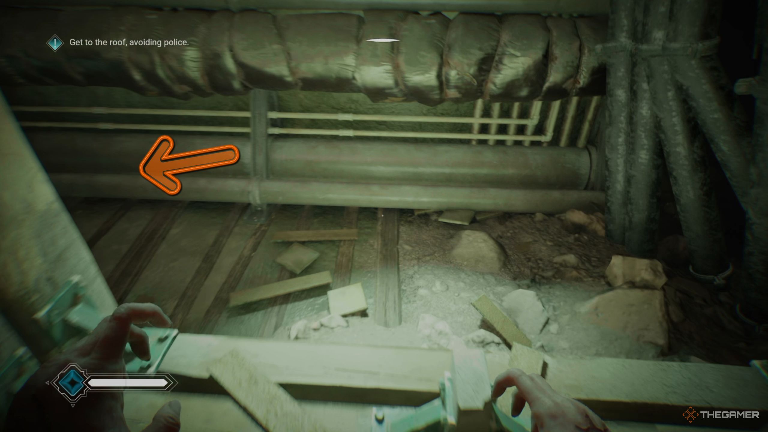 Как только вы перейдёте через мост, войдите в комнаты впереди. Начните с осмотра окровавленной посылки возле граффити. Затем поищите путь, ведущий вперёд, рядом с лампой – там вы найдёте ещё одного полицейского. Вам нужно проскользнуть мимо этого офицера, не начиная драку.