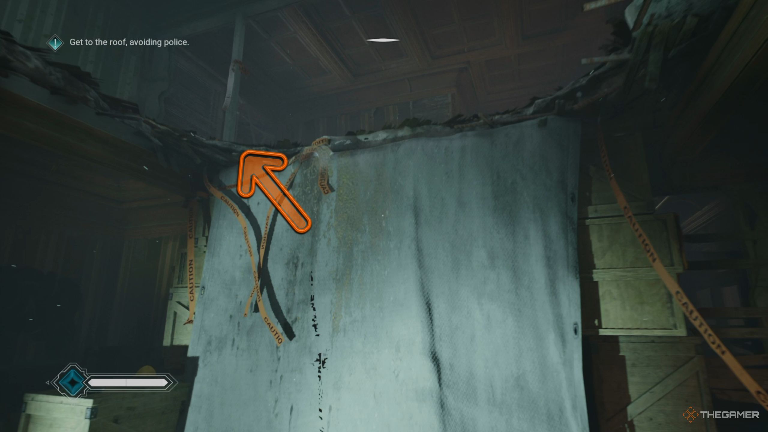 Далее вам нужно будет войти в основную часть здания и найти вход. Однако вы не сможете использовать его для побега, так как он сильно охраняется полицией. После проверки двери посмотрите на правую сторону комнаты и используйте свое особое зрение, чтобы найти синюю трубу внутри шахты лифта.