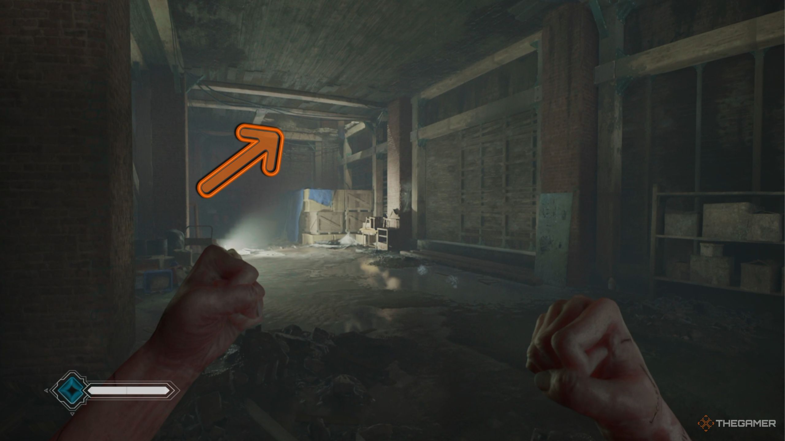 После победы над вторым офицером просто продолжайте следовать по пути, пока не дойдете до более просторной комнаты с лестницей. Использовать лестницу вы не сможете – вместо этого вам нужно будет запрыгнуть на ящики, а затем перепрыгнуть через отверстие в углу, чтобы достичь верхнего уровня. Продолжая движение по коридору мимо этого отверстия, вы запустите кат-сцену, где встретитесь с Фабьеном.