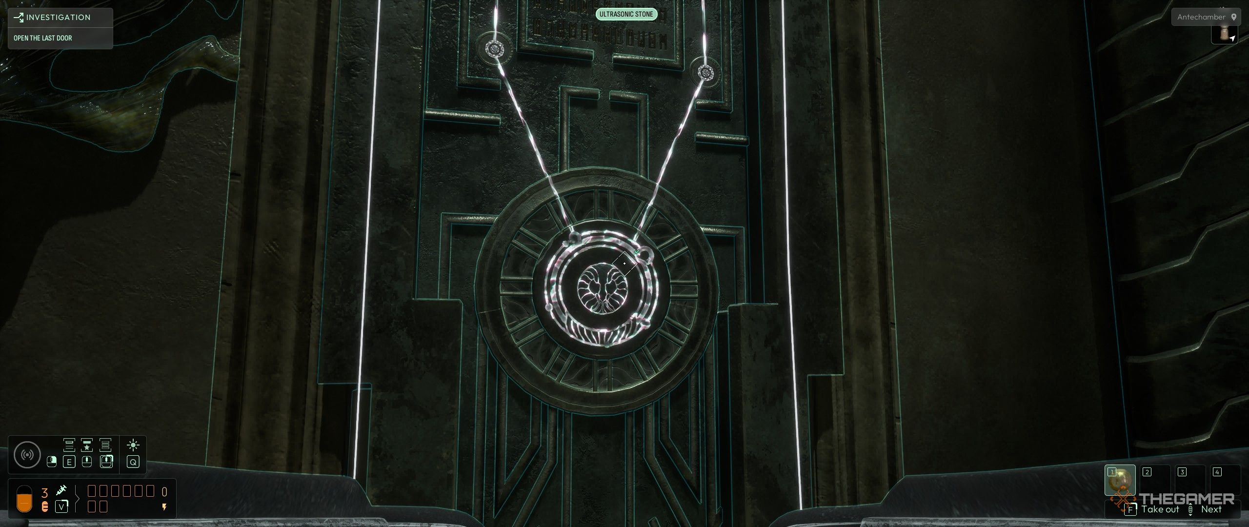 Начните с использования частот Yith Alloy и Gold Symbols на всех больших каменных столбах – известных как молитвы – в центральной области. Затем спуститесь по левой лестнице в единственную доступную комнату. Прочитайте надпись на двери – в ней упоминается «песня» – и вернитесь в главную область. Изучите Молитву Мастеров, чтобы разблокировать частоту Ультразвукового Камня. Наконец, используйте свой Сонар с этой новой частотой, чтобы открыть дверь.