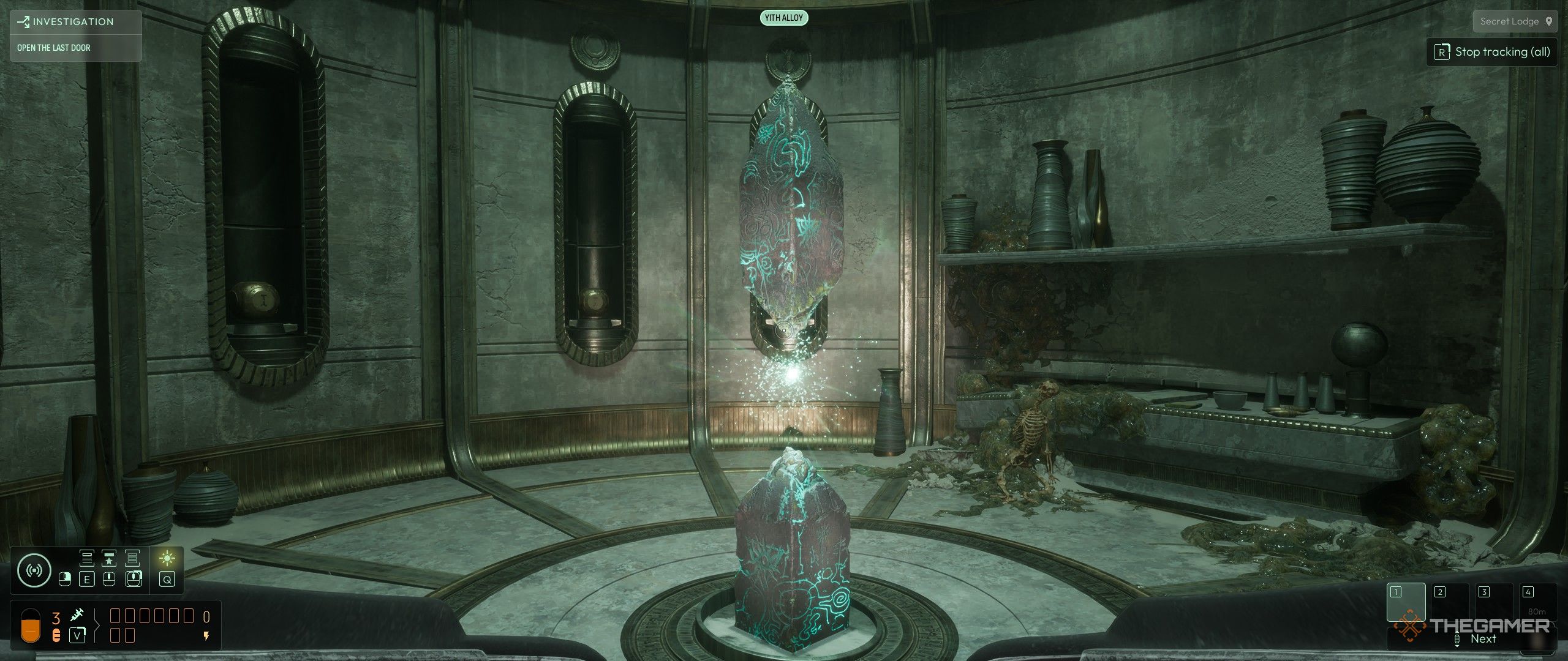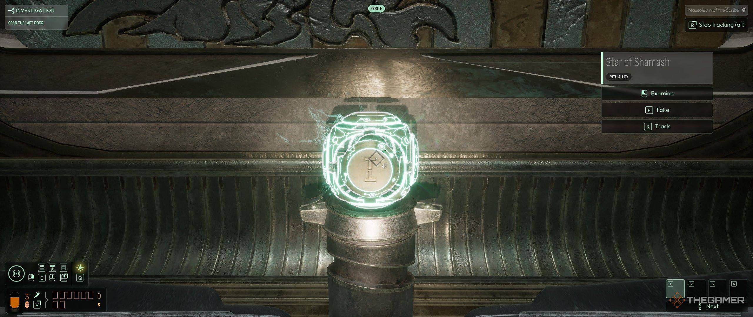 Спуститесь по правой лестнице на третий уровень вниз и повторите поиск в следующей комнате, в которую вы можете войти, чтобы найти ‘Reconstruction: The Possibilities’. Ищите подсказки, используя как Gold Symbols, так и радар Yith Alloy. Как только вы их найдете, взаимодействуйте с картой и кристаллами на правой стороне комнаты. Изучение этих кристаллов откроет частоту Pyrite, позволяя вам превращать металлические кубы в пирамиды. Эти пирамиды затем можно использовать в качестве мостов для доступа к большему количеству комнат в центральной области.