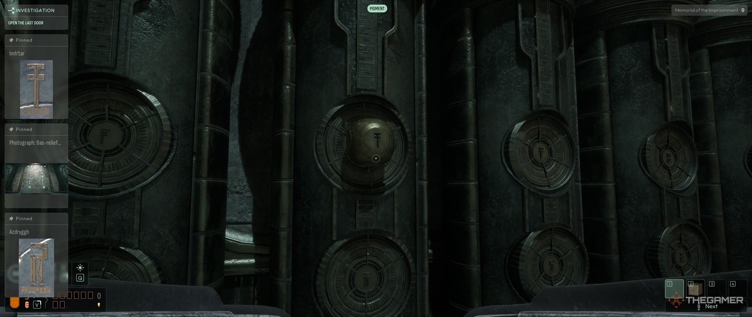 Ищите золотые символы, чтобы получить подсказки, затем проверьте чашу или инструменты для гравировки рядом со скелетом, чтобы разблокировать способность Пигмент. Эта способность позволяет вам читать выцветшие надписи и видеть секретные символы на картинах в мавзолеях, поэтому обязательно используйте её на каждой большой картине, которую вы встретите.