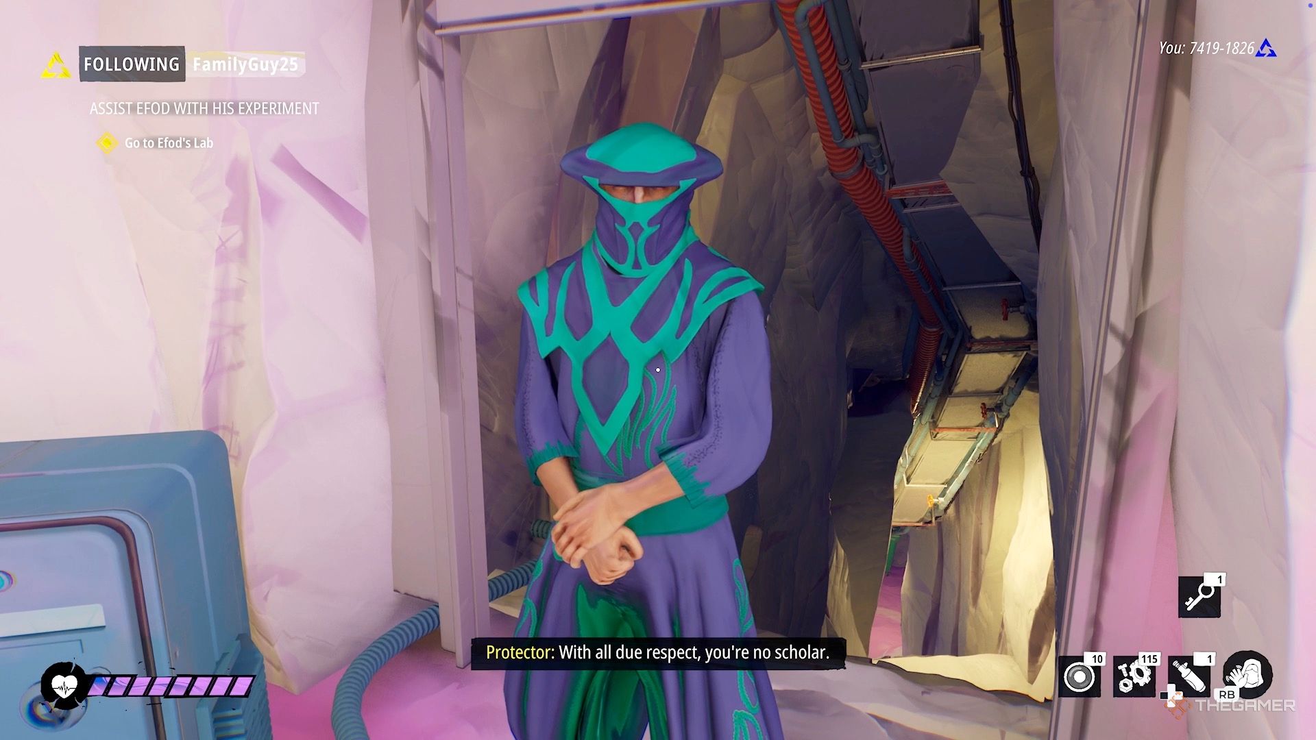 Как только вы окажетесь в центральной области, поднимитесь по каменной лестнице, а затем поднимитесь по металлическим ступеням справа. Вы найдете Efod, прислонившегося к перилам наверху.