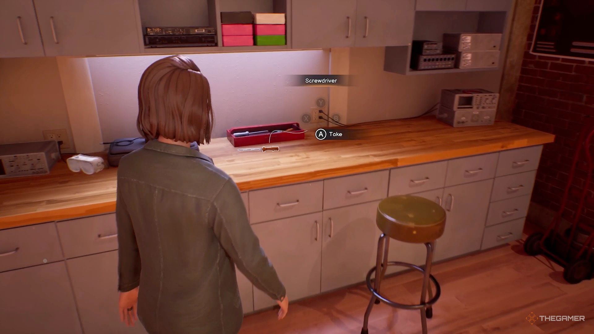 Начните с захвата отвёртки, которая находится над и справа от шкафа.