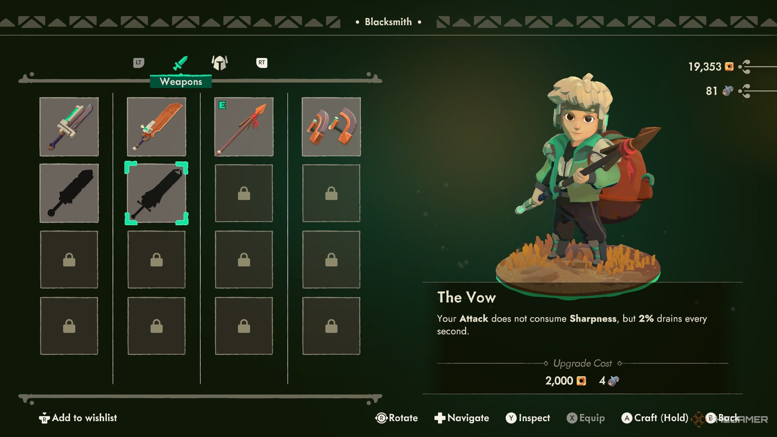 После того, как вы завершите область, прикоснитесь к парящему свитку на подставке, чтобы узнать, как создать большой меч The Vow. После этого вы можете либо вернуться в город, либо продолжить исследовать подземелье. Когда вы вернетесь в город, подойдите к кузнецу напротив вашего магазина и поговорите с ним. Теперь вы должны иметь возможность купить The Vow за 2 000 Gold и 4 Sun Eater фрагмента.
