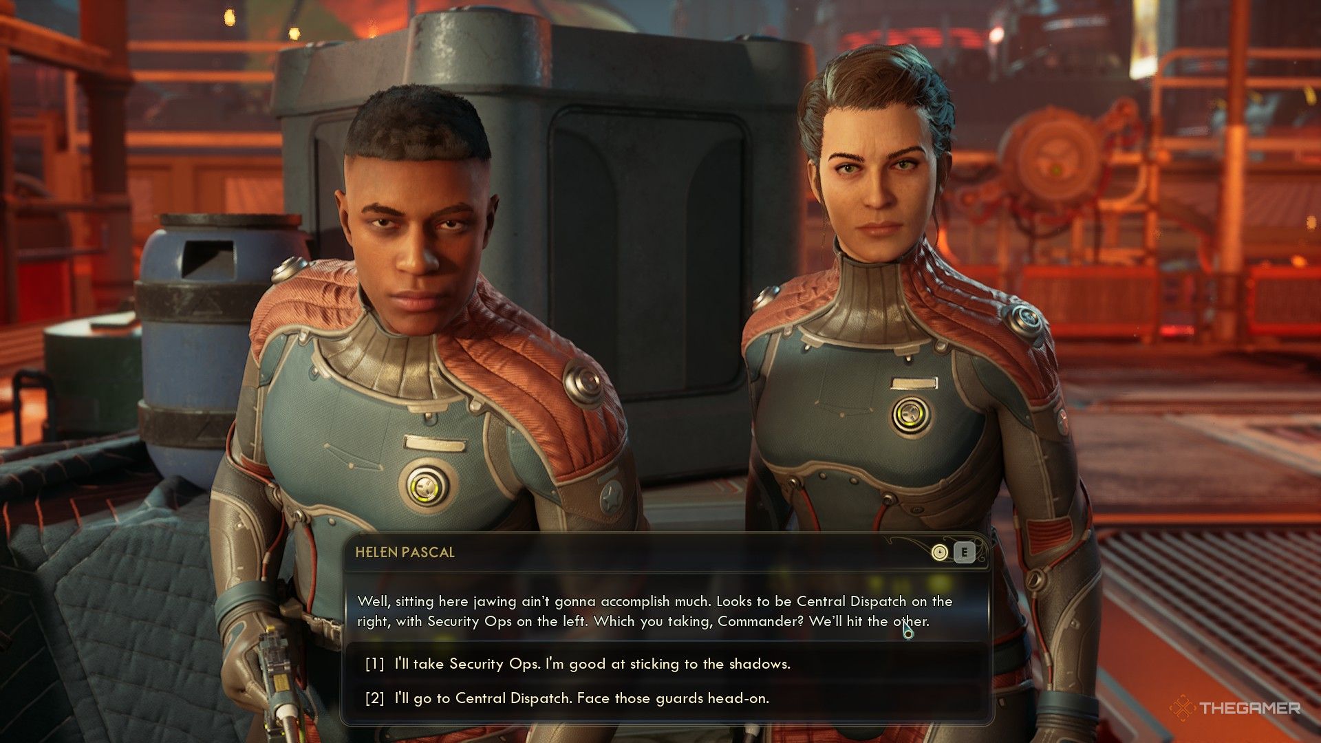 После того, как вы обойдете систему безопасности, вам нужно будет разделить свою команду. Вам придется выбрать между двумя путями: Security Ops, который делает упор на скрытность, или Central Dispatch, где вас ждет более прямой бой. Ваши товарищи по команде, Niles и Helen, автоматически выберут путь, который вы не выберете. Это решение незначительно повлияет на разговоры, которые у вас будут позже в игре.