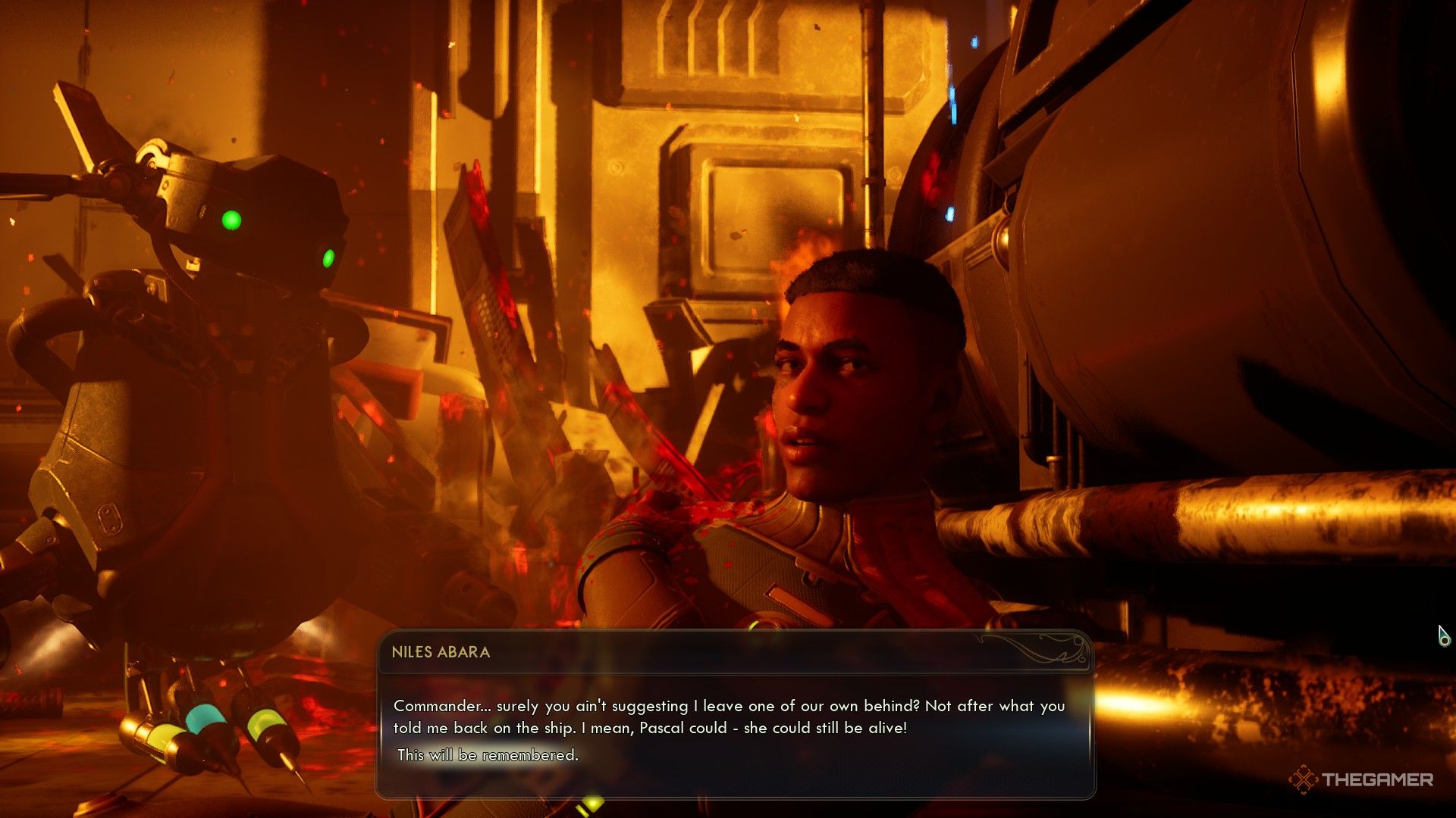 Когда вы приблизитесь к своей команде, произойдет взрыв, и Хелен исчезнет. Если вы ранее выбрали скрытный подход, вы встретите VAL, которая не сдвинет бессознательного Найлза, независимо от того, что вы скажете. Если вы выбрали другой путь, Найлз будет в сознании, и его реакция на вас будет зависеть от того, как вы с ним разговаривали ранее на корабле.