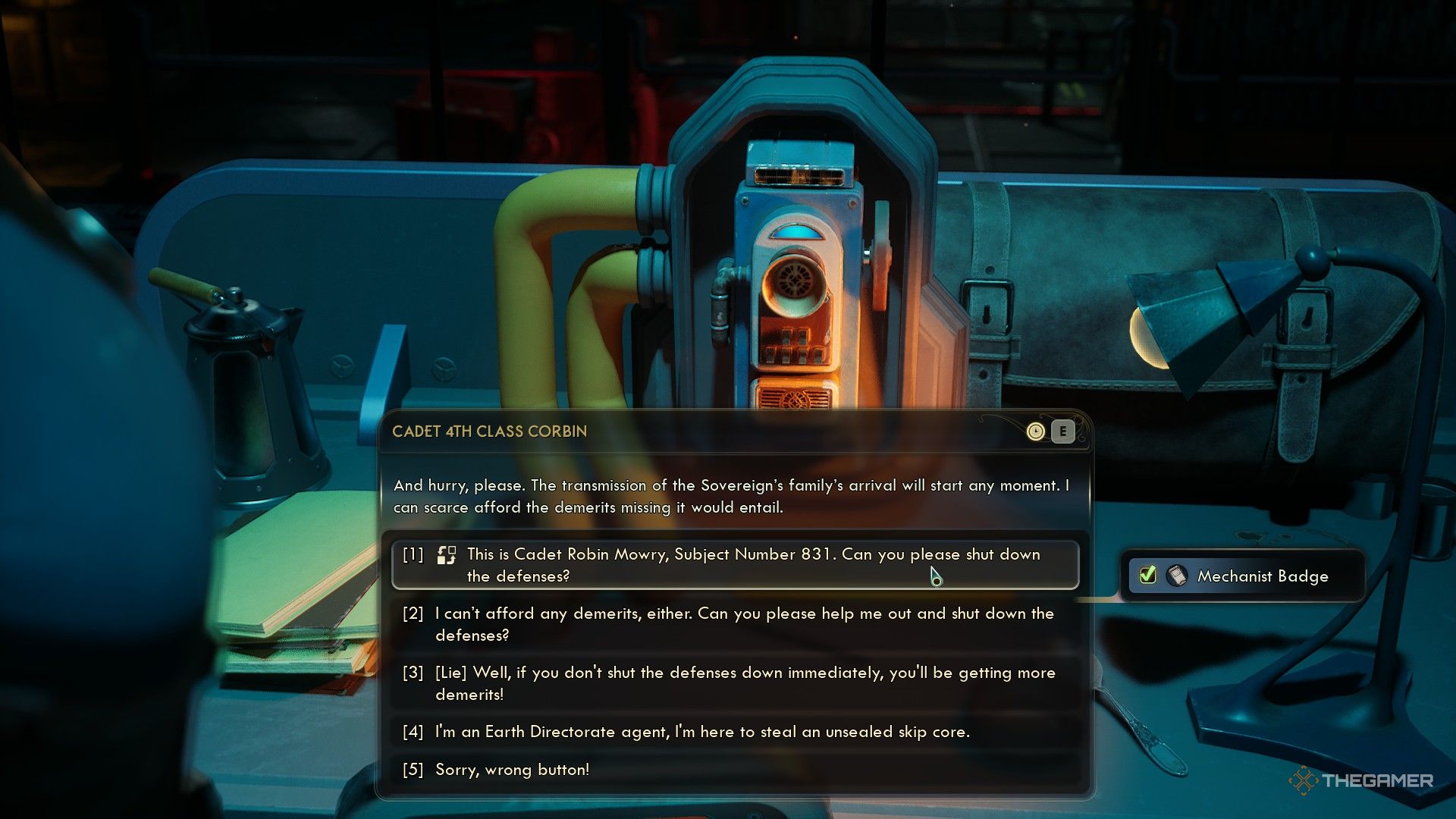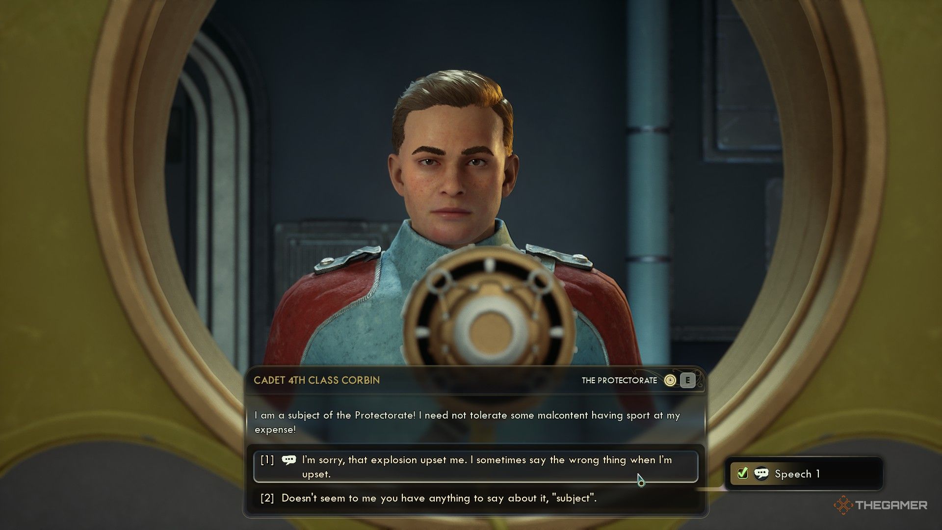 Если вы попытаетесь солгать или ввести в заблуждение, вам потребуется определенный уровень навыка Речи, чтобы добиться успеха. Вот путь разговора, который заставит кадета Корбина сотрудничать.