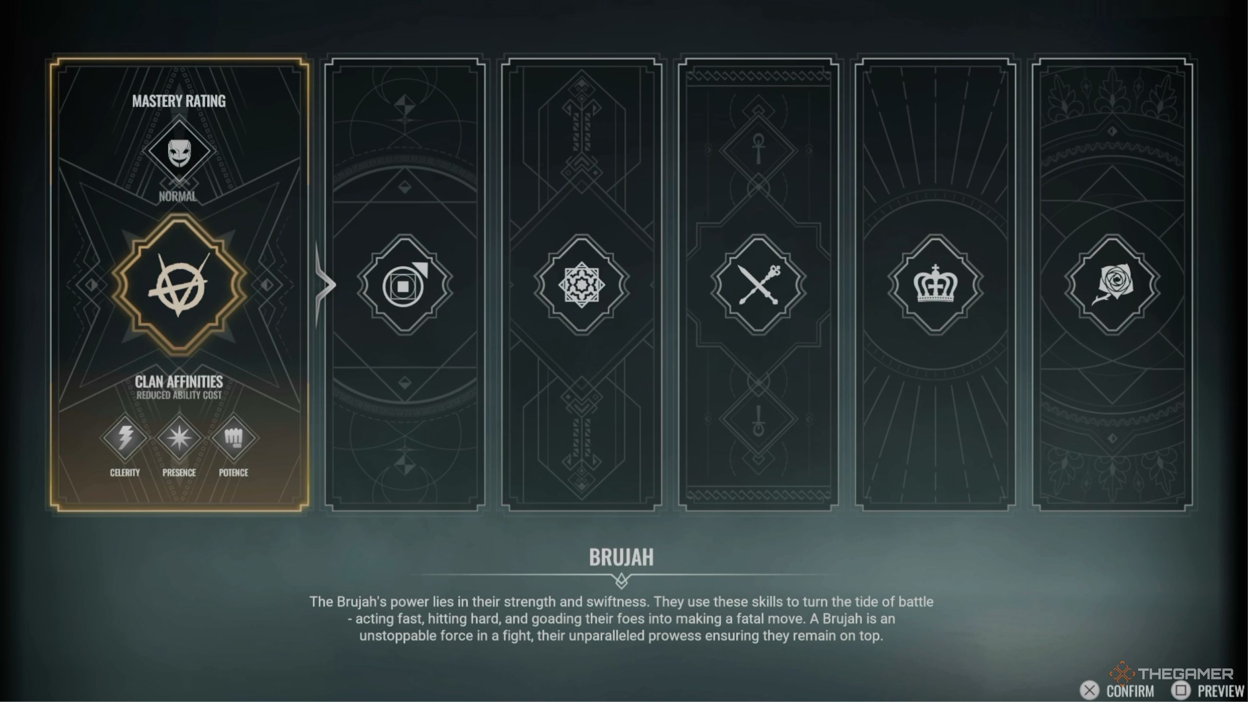 При выборе своего клана у вас будет шесть вариантов: Brujah, Tremere, Banu Haqim, Ventrue, Lasombra и Toreador. В отличие от некоторых других игр, вы не потеряете доступ к способностям кланов, которые вы не выбрали. Однако, после того, как вы сделаете свой выбор, вы навсегда потеряете уникальную пассивную способность, связанную с каждым другим кланом.