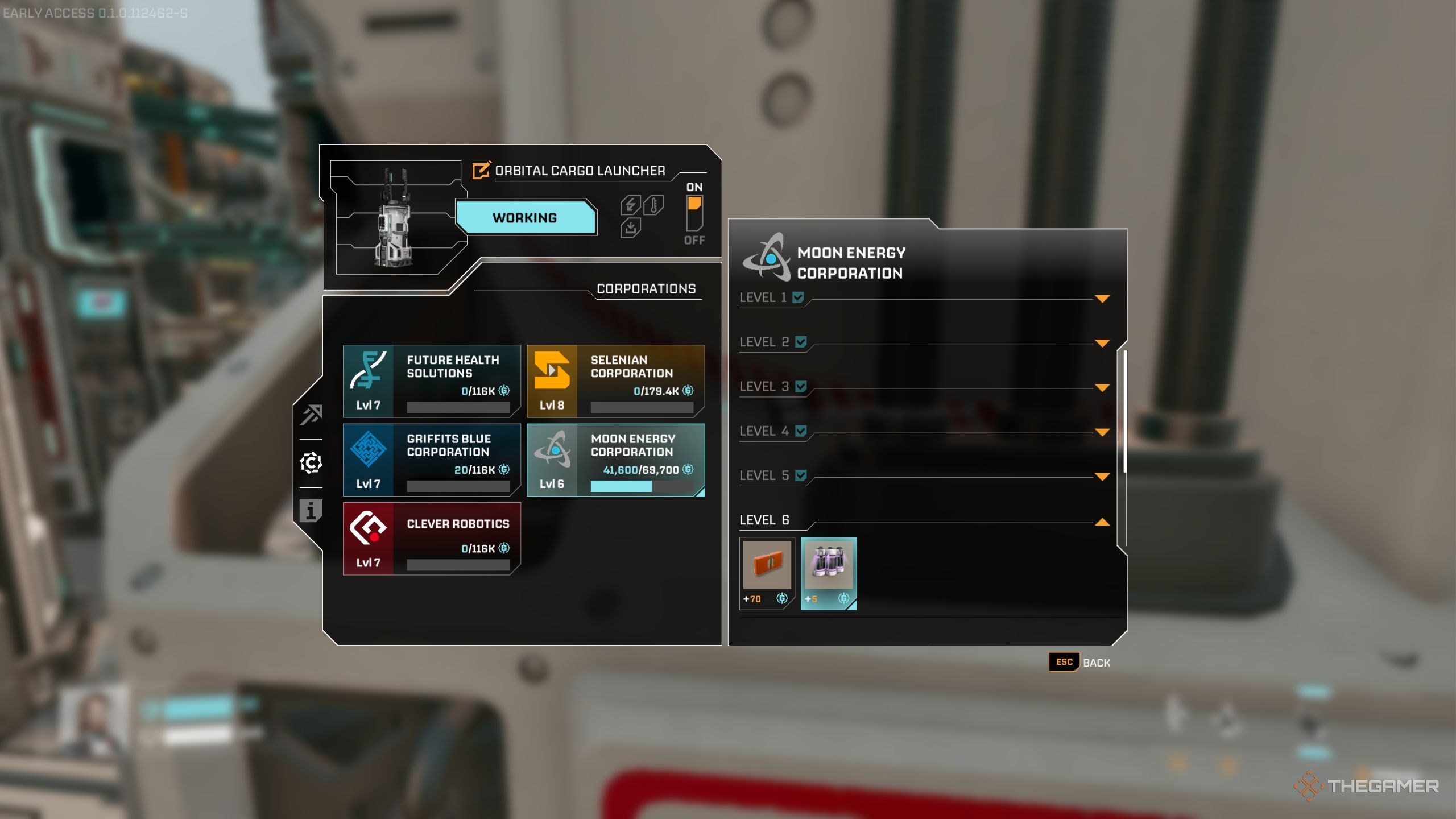 После завершения обучения, корпоративный терминал вашей базы будет разделён на пять корпораций, и вы увидите те же пять опций при выборе рецепта в Орбитальном грузовом терминале. Самый эффективный способ повысить свой статус в корпорации — это производить рецепты, а затем отправлять их через терминалы, используя рельсовую систему.