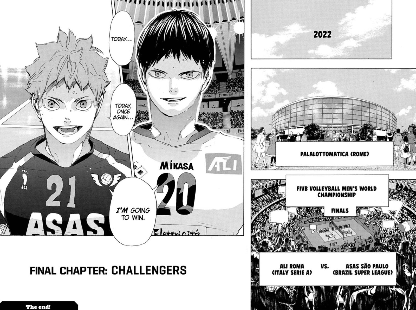 Финальная сюжетная арка Haikyu!! умело переносит нас вперед во времени. Мы видим Хината спустя годы после окончания учебы, который тоскует по дому, тренируясь в пляжный волейбол в Рио. Он неожиданно воссоединяется с Оикавой, и они становятся наставниками друг для друга, вновь зажигая страсть друг друга к спорту. Спустя два года Хината возвращается в Японию с целью стать профессиональным игроком и в конечном итоге достигает своей мечты, присоединившись к MSBY Black Jackals, команде первого дивизиона.