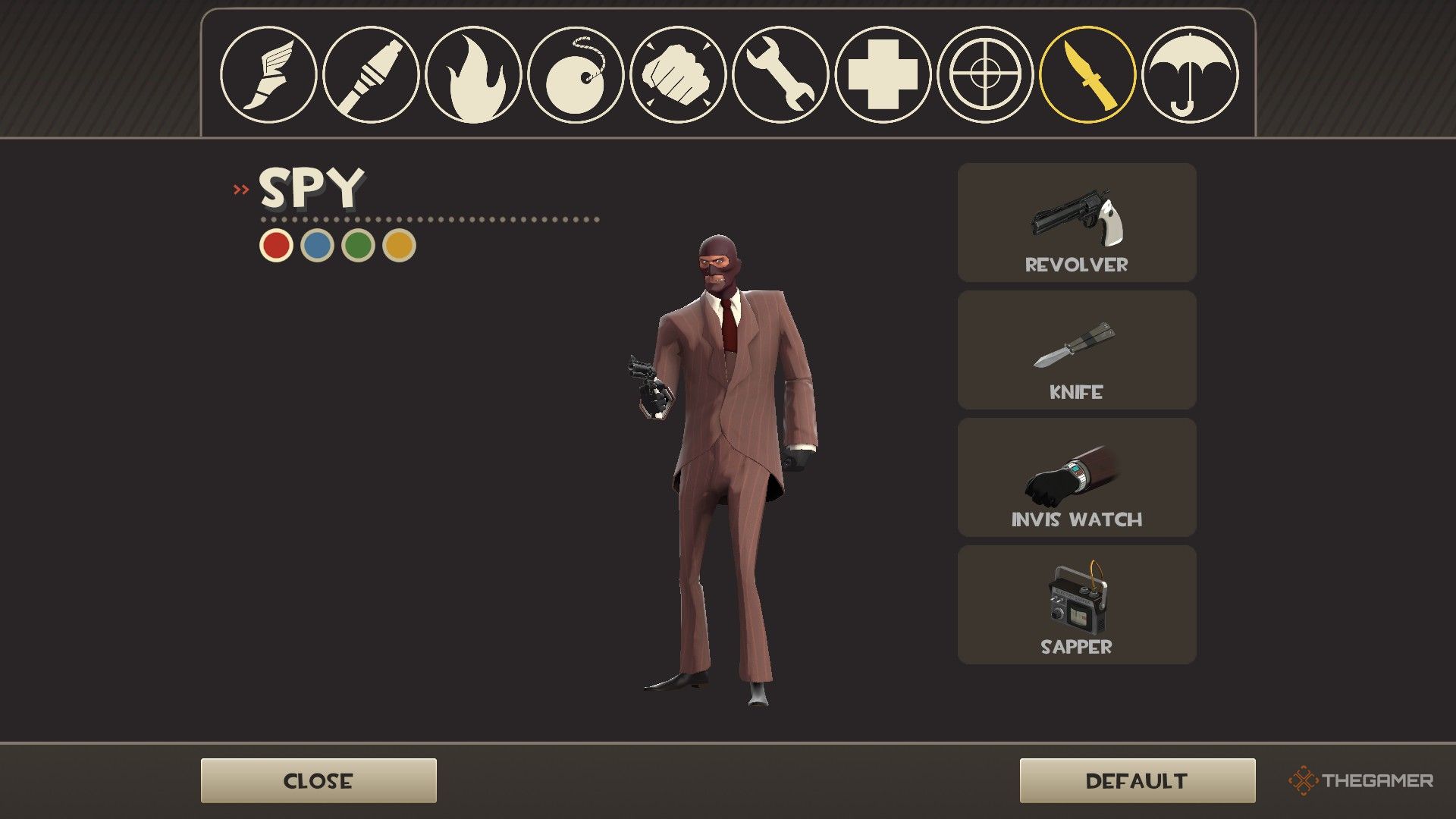 Помимо своего ножа, который может мгновенно устранять противников при атаке сзади, Шпион использует либо Револьвер, либо Усыпляющий Пистолет в качестве основного оружия. Он также оснащен Часами Невидимости, которые временно делают его невидимым, и Разминировщиком, который он использует для отключения и уничтожения вражеских устройств, таких как Пулеметные Башни, построенные Инженерами.