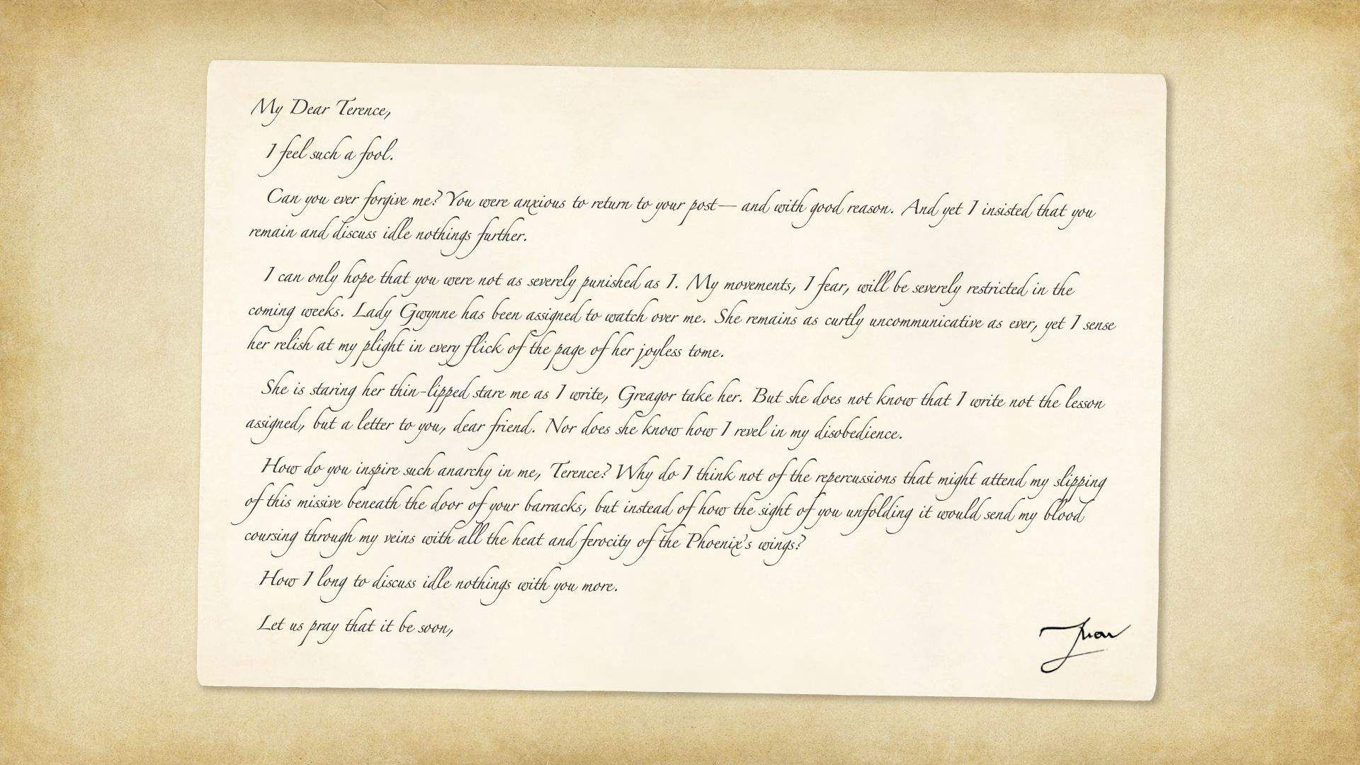 После прибытия Клайва, Джошуа и Диона в Ориджин, Терренс обнаруживает, что Гарпократ составляет историческую хронику. Вспоминая письма, которые он хранил от Диона на протяжении многих лет, Терренс передаёт их Гарпократу, надеясь, что они будут включены. Он опасается, что Диона запомнят негативно – как принца, который убил свою семью и разрушил Твайнсайд – и хочет показать миру, что Дион был сложной личностью: умным, способным, красивым и добрым. Терренс верит, что эти письма докажут, что Дион был не просто монстром, как могут подумать некоторые.