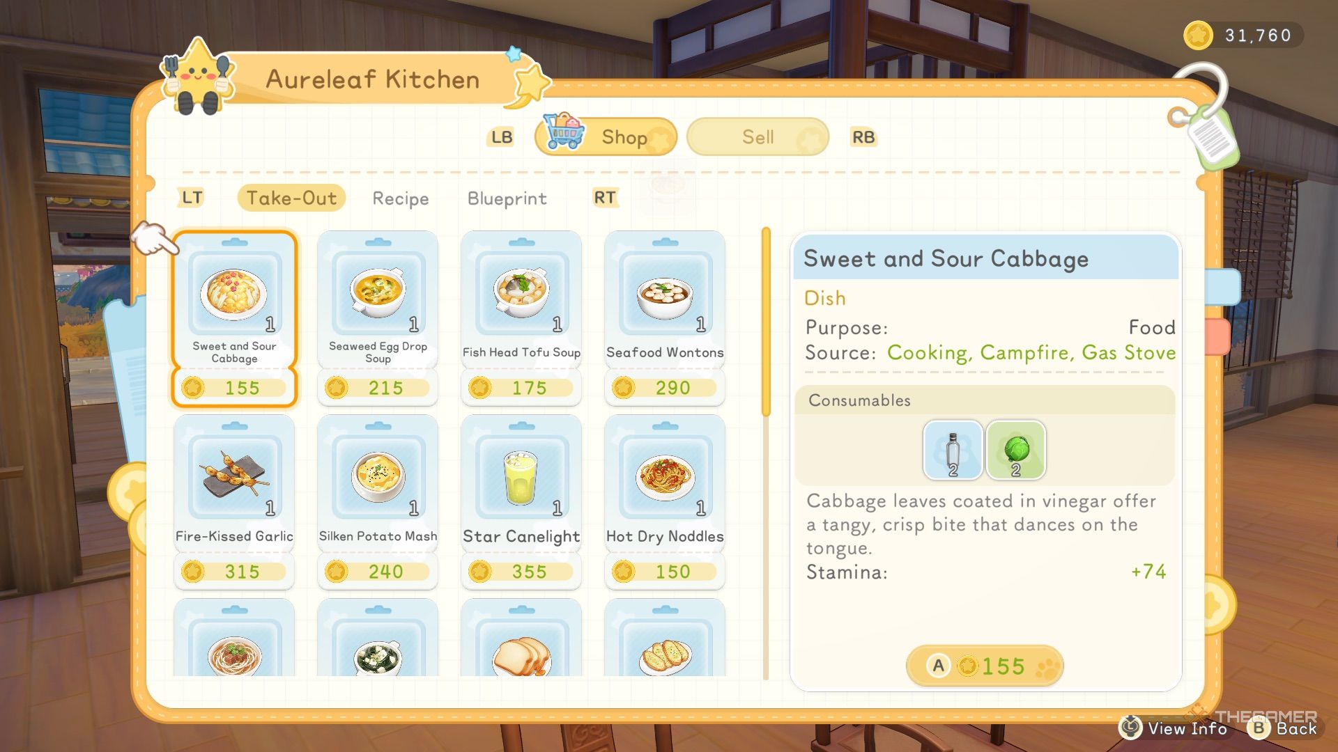 Окей, значит, если я хочу получить новые рецепты на Auraleaf Kitchen, мне просто нужно прийти, когда она откроется. Затем я подхожу к стойке и нажимаю кнопку, чтобы открыть меню. Оттуда я могу либо купить еду, чтобы съесть её сразу, либо – и это лучшая часть – я могу на самом деле выучить рецепт и приготовить его сам позже!