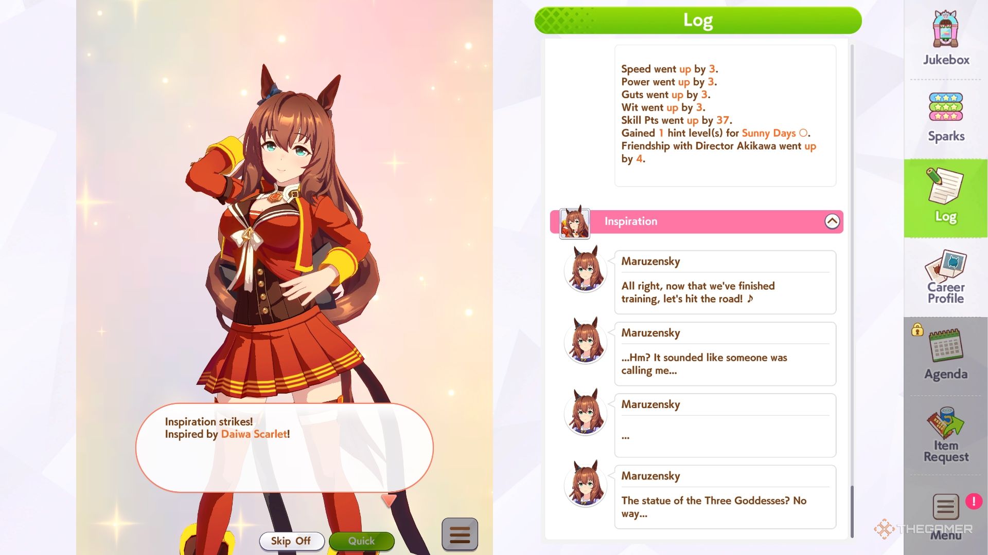 | После гонки | Победа! (G2 и G3) | Верх: -15 Энергии, +8 к случайной характеристике, +35 Очков Умений