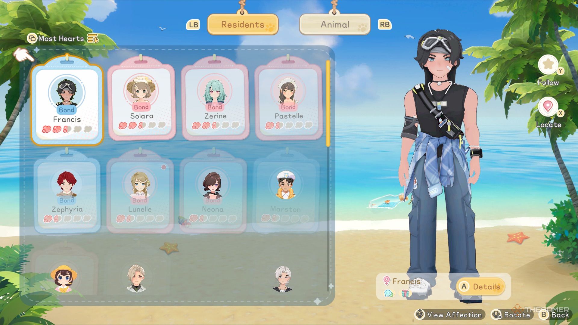 Чтобы повторить то, что вы узнали о жителях острова Звёздный Песок, откройте свой Телефон и перейдите в раздел «Социальные сети». Там вы найдёте информацию обо всех, с кем встречались, включая ваши отношения с ними и подарки, которые им особенно понравились.