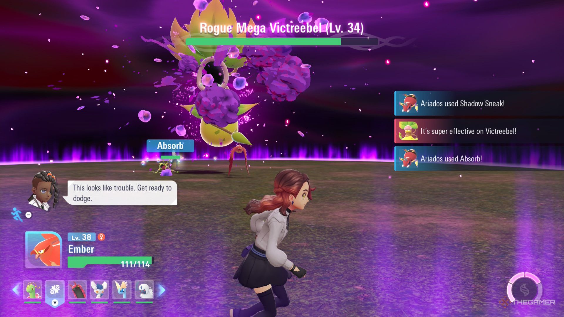 Вы столкнетесь с Absol в своей первой Rogue Mega битве, как только достигнете Ранга V. Для этого боя вы не будете использовать своих собственных покемонов – вместо этого вы временно будете сражаться с Lucario. Это разработано, чтобы помочь вам понять, как работают эти специальные битвы, а не полагаться на заранее спланированную команду.