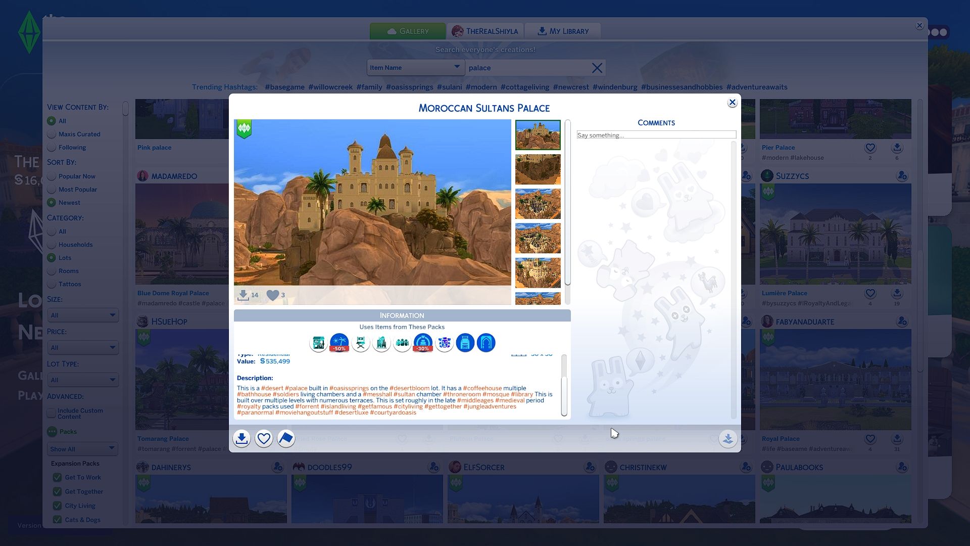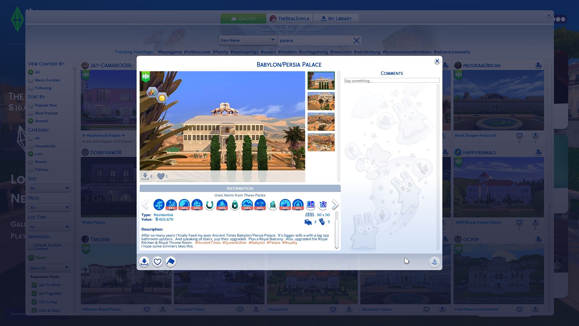 Этот дворец построен для роскошной жизни, с просторной, спа-подобной ванной комнатой и открытым, роскошным дизайном. Он предлагает много места для ваших Sims, но идеально подходит для одного, могущественного правителя. Устраивайте экстравагантные вечеринки, балуйте семью своего Sim и украшайте все роскошной мебелью, которую только пожелаете.