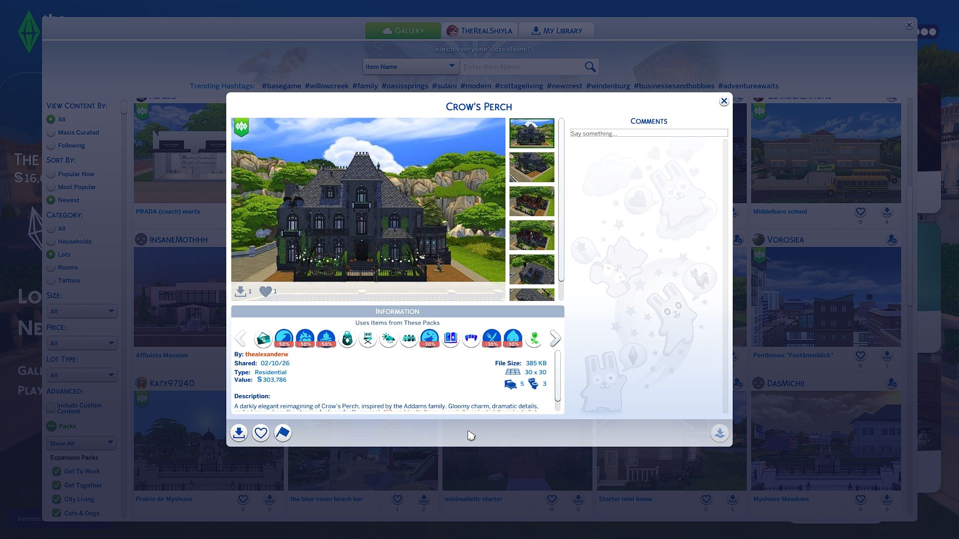 Ни одна коллекция фэнтезийных замков и дворцов не будет полной без жуткого готического особняка – такого, который легко можно превратить в настоящий замок. Вдохновлённый культовым домом семьи Аддамс, строитель thealexanderw создал Crow’s Perch, позволяя всем игрокам The Sims ощутить роскошный и мрачно красивый стиль этого дома.