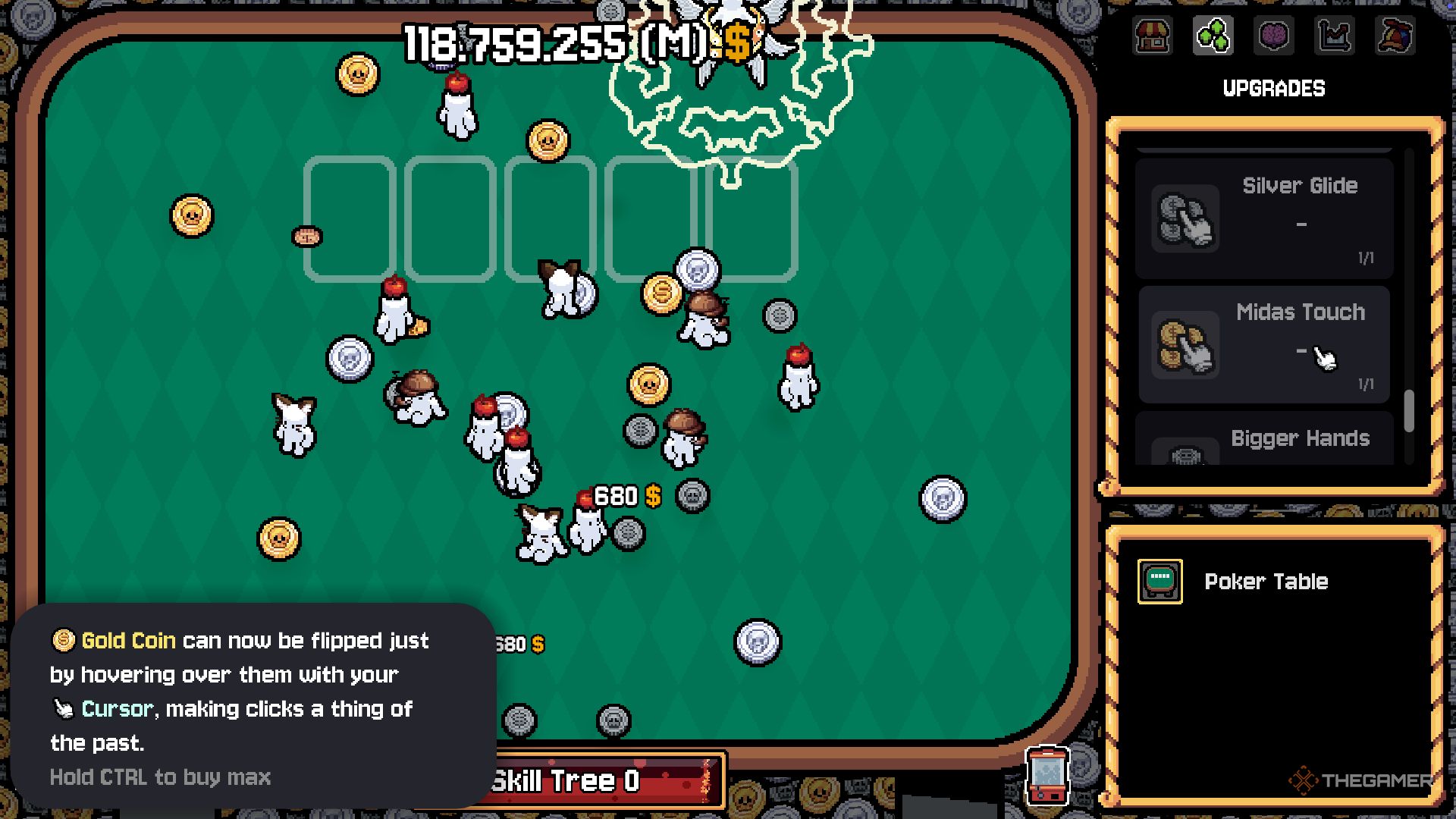 Вы можете приобрести улучшения, такие как Silver Glide и Midas Touch, которые позволяют переворачивать монеты, просто перемещая по ним курсор – вам не нужно будет нажимать! Хотя на первый взгляд они могут показаться незначительным удобством, эти улучшения на самом деле очень полезны для быстрого перелистывания большого количества монет одна за другой.