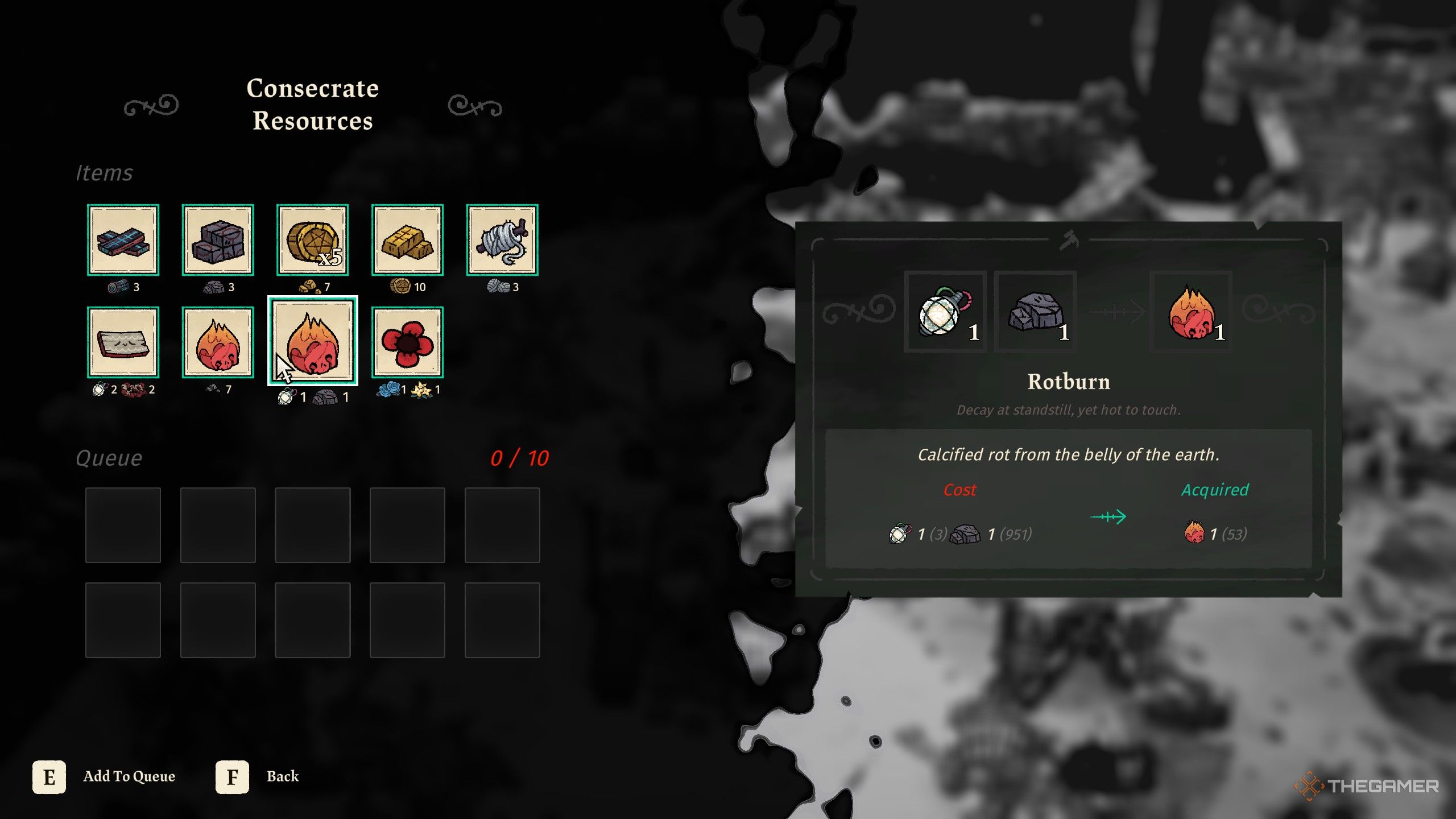 Хотя вы можете изготовить Rotburn на Переработчике, это неэффективное использование ваших ресурсов. Вы найдёте предостаточно Rotburn во время исследования горы Ewefall, поэтому, скорее всего, вам не понадобится изготавливать больше. Разумнее сохранить Заряженные Осколки для изготовления Нагревателей позже в игре.