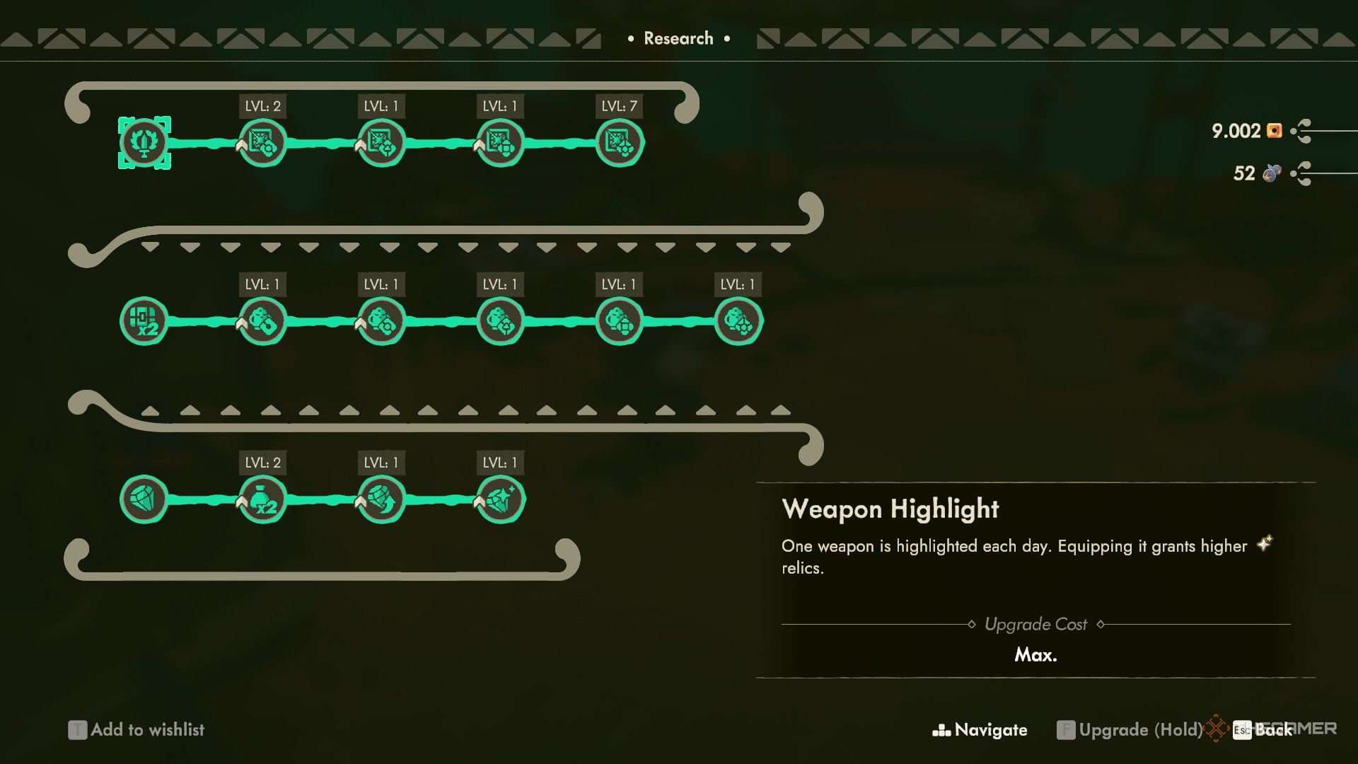| Разблокировка Делюкс Реликвий | Tomo | Да, я включу каждое из первых улучшений в Исследования, потому что они действительно настолько полезны. Подобно Подсветке Оружия, наличие добычи с более высокой стоимостью даст вам больше золота на ранних этапах. |