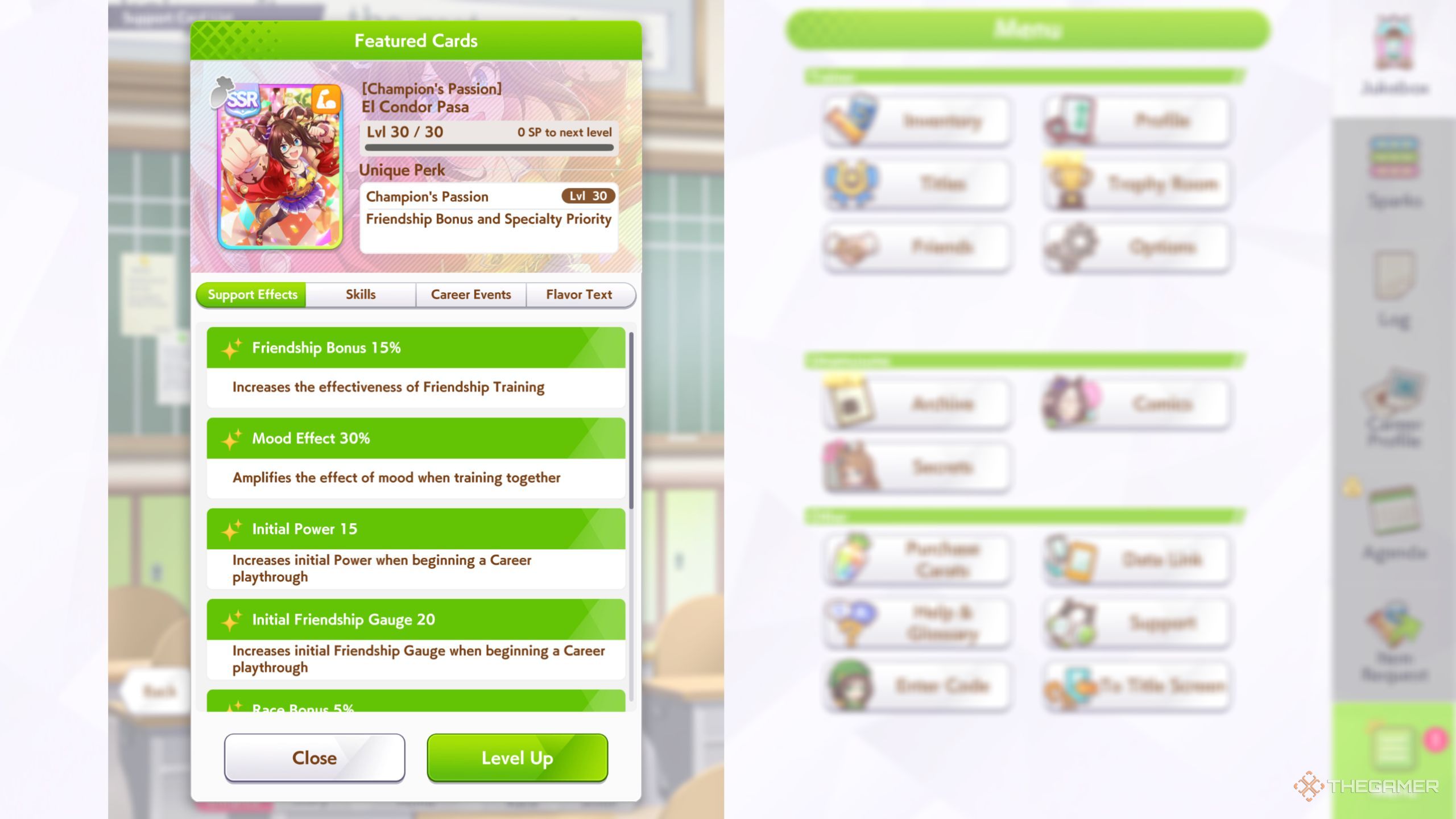 Карты поддержки дают вам значительные преимущества на протяжении всего прохождения, такие как получение большего количества фанатов во время гонок и получение бонусных очков при использовании методов тренировок, которые они предпочитают. Если карта поддержки активна на золотой панели, она также может открыть специальную радужную или дружескую тренировку, когда появляется предпочтительный метод.