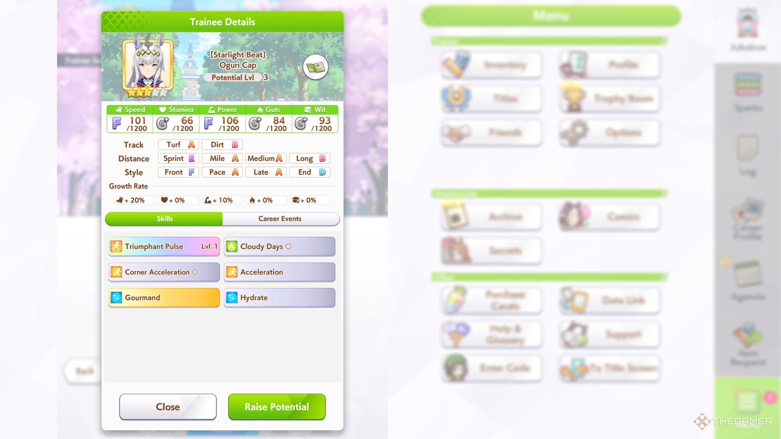 После того, как вы улучшите Скорость своей лошади, вы можете начать работать над Силой, Выносливостью и Интеллектом Огури Кэп. Хотя Выносливость и не самый важный параметр, стремитесь поднять его выше 300, а в идеале — около 400, чтобы хорошо выступать в более длинных гонках. Вам также стоит изучить некоторые навыки, повышающие выносливость, чтобы помочь ей оставаться конкурентоспособной.