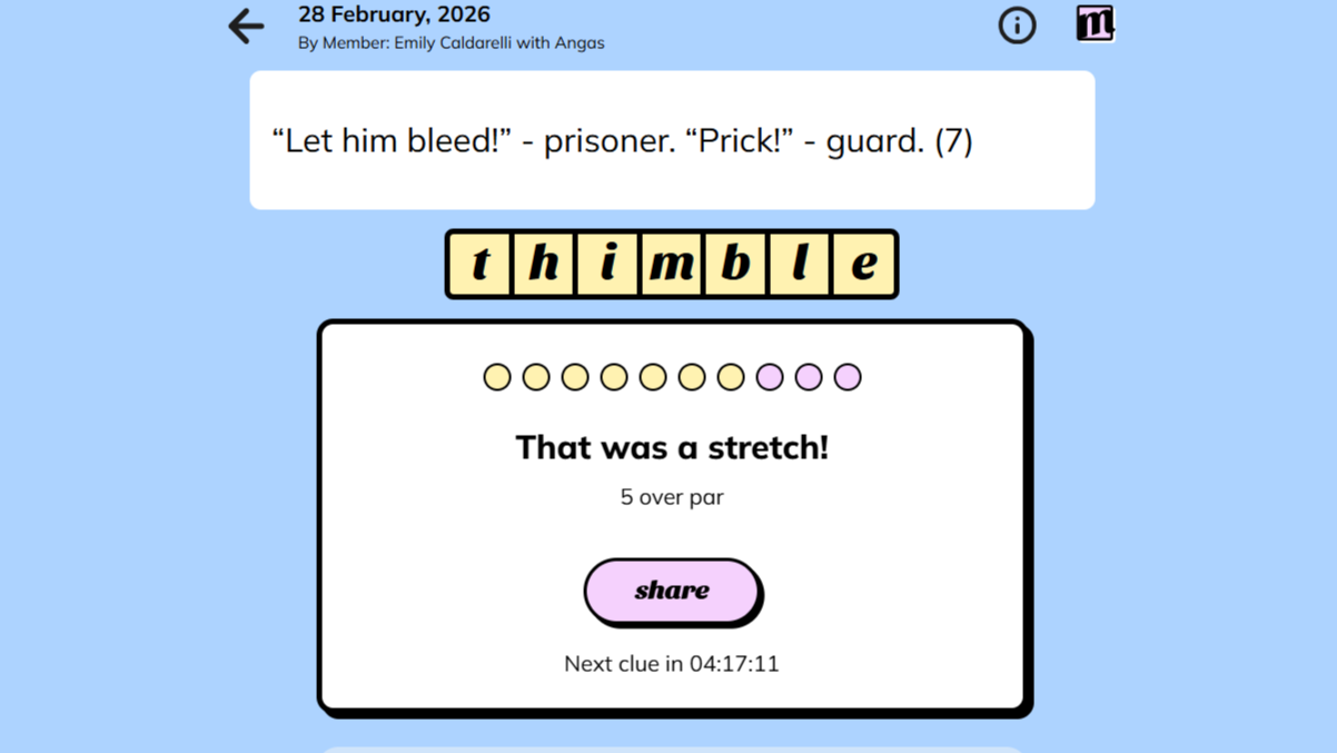 Ответ на сегодня — Напёрсток. Вот как мы к этому пришли: Загадка использует слово ‘prisoner’ (заключенный), чтобы указать на скрытое слово. Подумайте о ‘напёрстке’ как о ‘заключенном’ или спрятанном внутри фразы ‘nearby fodder’ (близлежащий корм) — вам нужно внимательно присмотреться, чтобы его найти!
