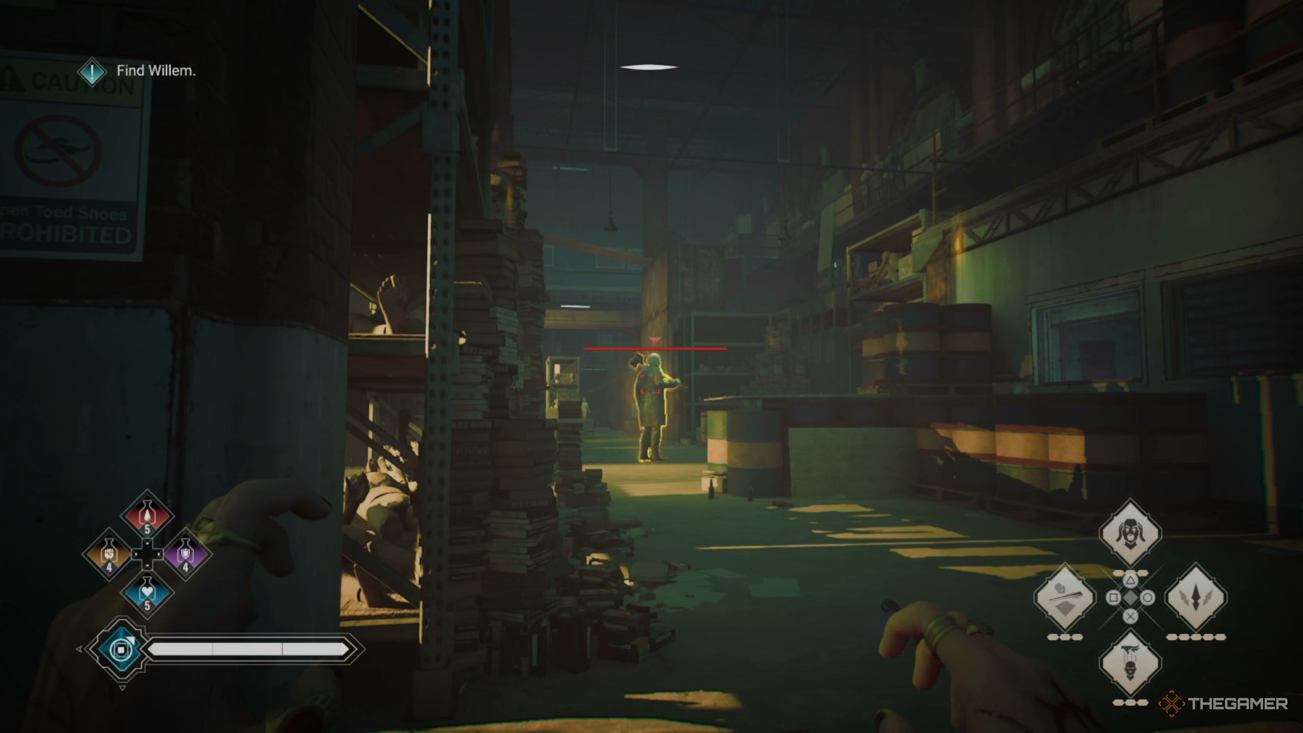 Окей, так когда Виллем бросает тебя в эту иллюзию, ты по сути переживаешь один и тот же пластиковый завод три раза. Это немного странно, но каждый раз, когда ты попадаешь в открытое пространство, всё меняется. Первые два раза посвящены сражениям с врагами, но в третий раз тебя ждёт небольшая головоломка. О, и в самый первый раз, когда ты проходишь, ты найдёшь Sabbat, болтающегося в главной части завода.