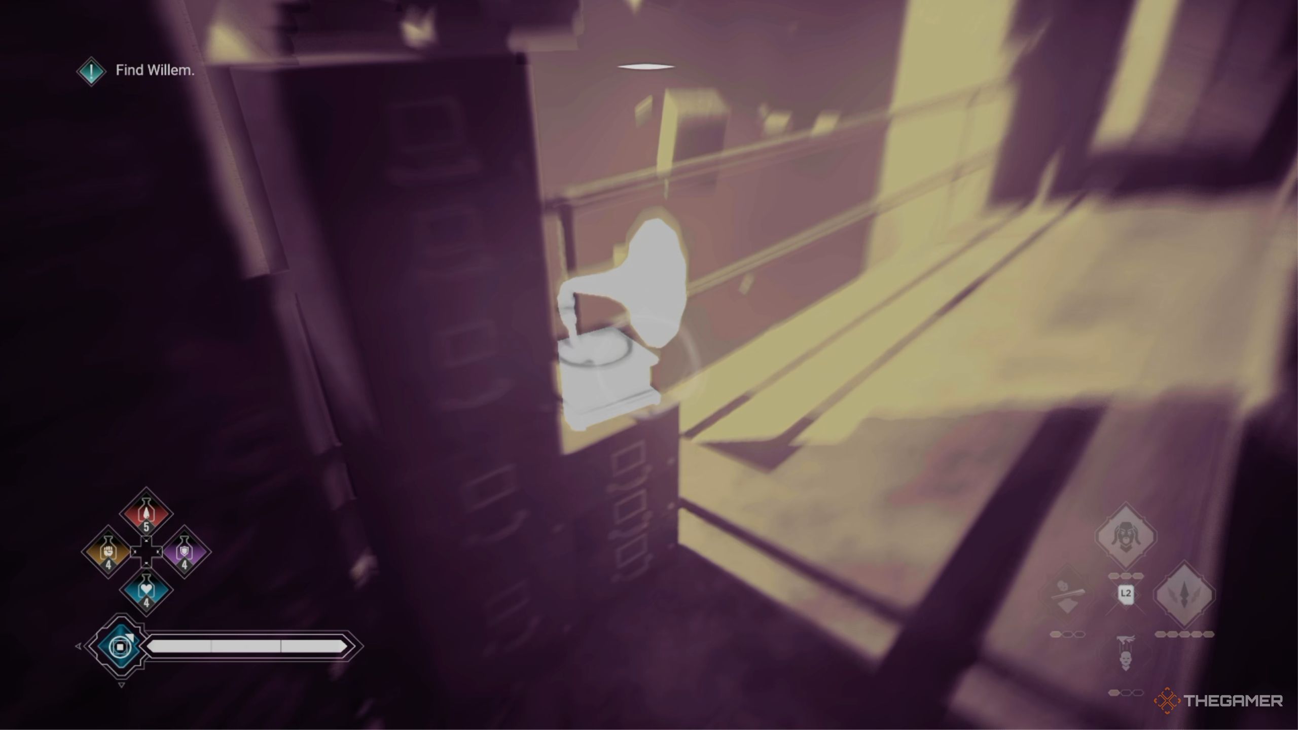 Спуститесь по лестнице, чтобы попасть в комнату, содержащую простую головоломку. Используя своё Усиленное Чувство, вы заметите три рычага, расположенных по всей комнате. Чтобы открыть убежище Виллема, вам нужно потянуть эти рычаги один за другим и быстро! Начните с рычага, ближайшего ко входу, затем быстро перейдите к рычагу рядом с контейнером.