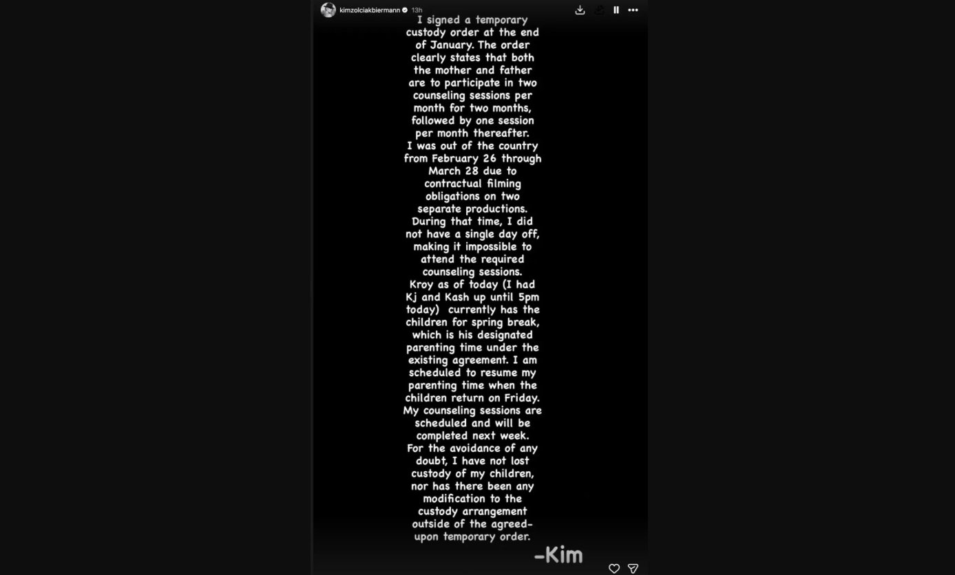 Окей, так что драма между Ким Зольчак и Крой Биерманн продолжается, и судья постановил, чтобы Ким посещала терапию для родителей. Очевидно, ей нужно пройти четыре сессии между 3 и 13 апреля, как раз во время весенних каникул у детей. Все это часть их продолжающейся битвы за опеку, и суд явно считает, что профессиональная помощь сейчас может быть полезной.