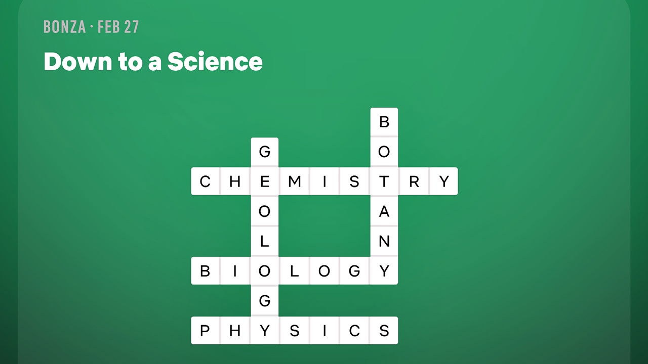 Подсказка к сегодняшнему головоломке Bonza – ‘Down to a Science’, что говорит о немного более легком испытании в пятницу. Головоломка просит вас соединять плитки и составлять названия различных областей науки.