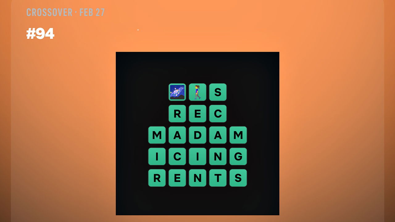 Сегодняшняя головоломка – Crossover #94. Вам нужно будет менять плитки местами, чтобы вписать ответы в сетку. Также есть подсказка в виде эмодзи, которая описывает, что делают астронавты, когда они находятся за пределами своих космических кораблей.