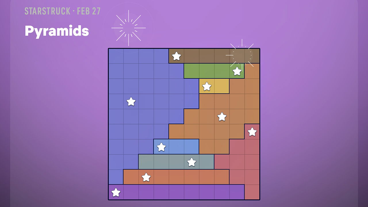 Starstruck – это головоломка, в которой вам нужно расставлять звёзды на сетке. Цель состоит в том, чтобы в каждой строке, столбце и цветной области была ровно одна звезда, при этом звёзды не должны касаться друг друга – даже углами. Самая простая головоломка, доступная сегодня, называется «A или B?», а более сложная – «Пирамиды».