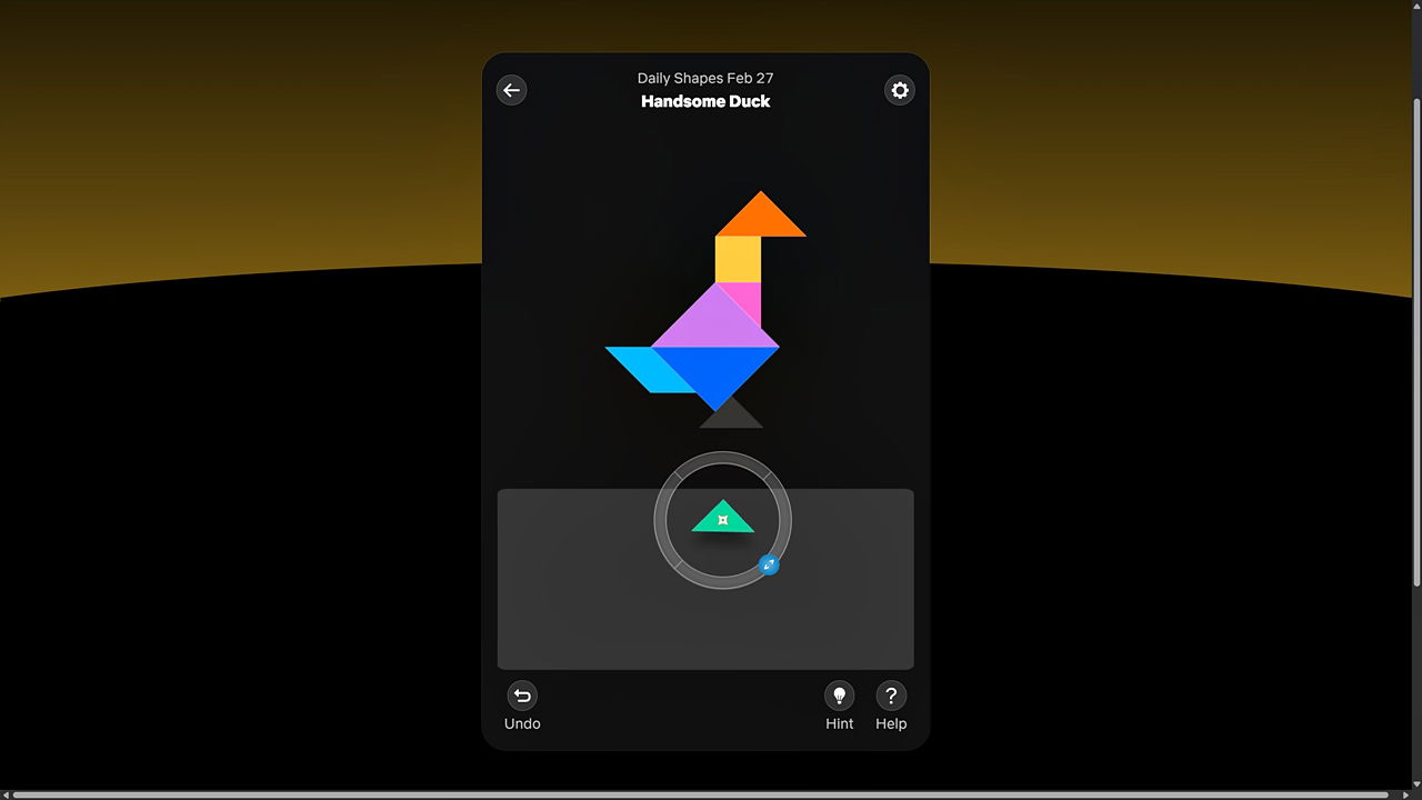 Головоломка ‘Handsome Duck’ предлагает вам создать контур самца мандаринки – птицы, известной своими красивыми и красочными перьями – используя детали танграма. После завершения решение выглядит так: