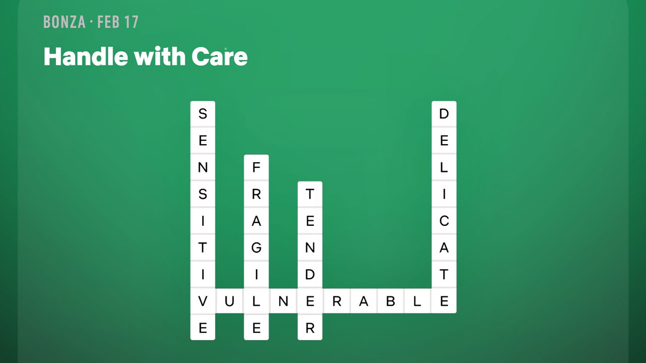 Сегодняшняя подсказка к головоломке Bonza — ‘Обращайтесь с осторожностью’. Это означает, что вы ищете слова, описывающие вещи, которые легко ломаются или с которыми нужно обращаться бережно. Найдите и соедините плитки, чтобы составить эти деликатные слова!
