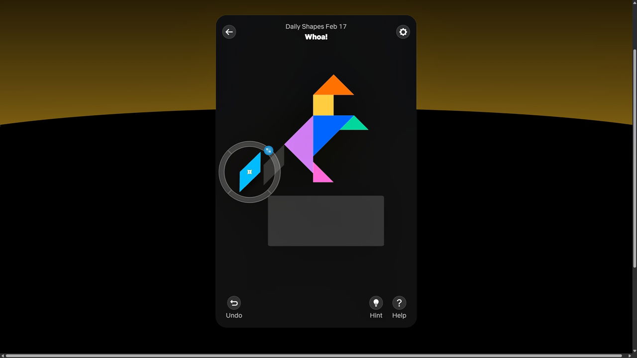 Головоломка ‘Whoa!’ предлагает вам создать контур лошади, используя детали танграма. Это новогодняя головоломка, посвященная Году Лошади, с этим сообщением: