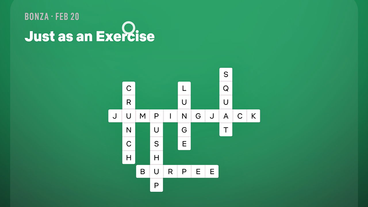 Сегодняшняя подсказка в головоломке Bonza — «Just as an Exercise», и она довольно простая! Ваша задача — соединить плитки, чтобы сформировать названия популярных упражнений.