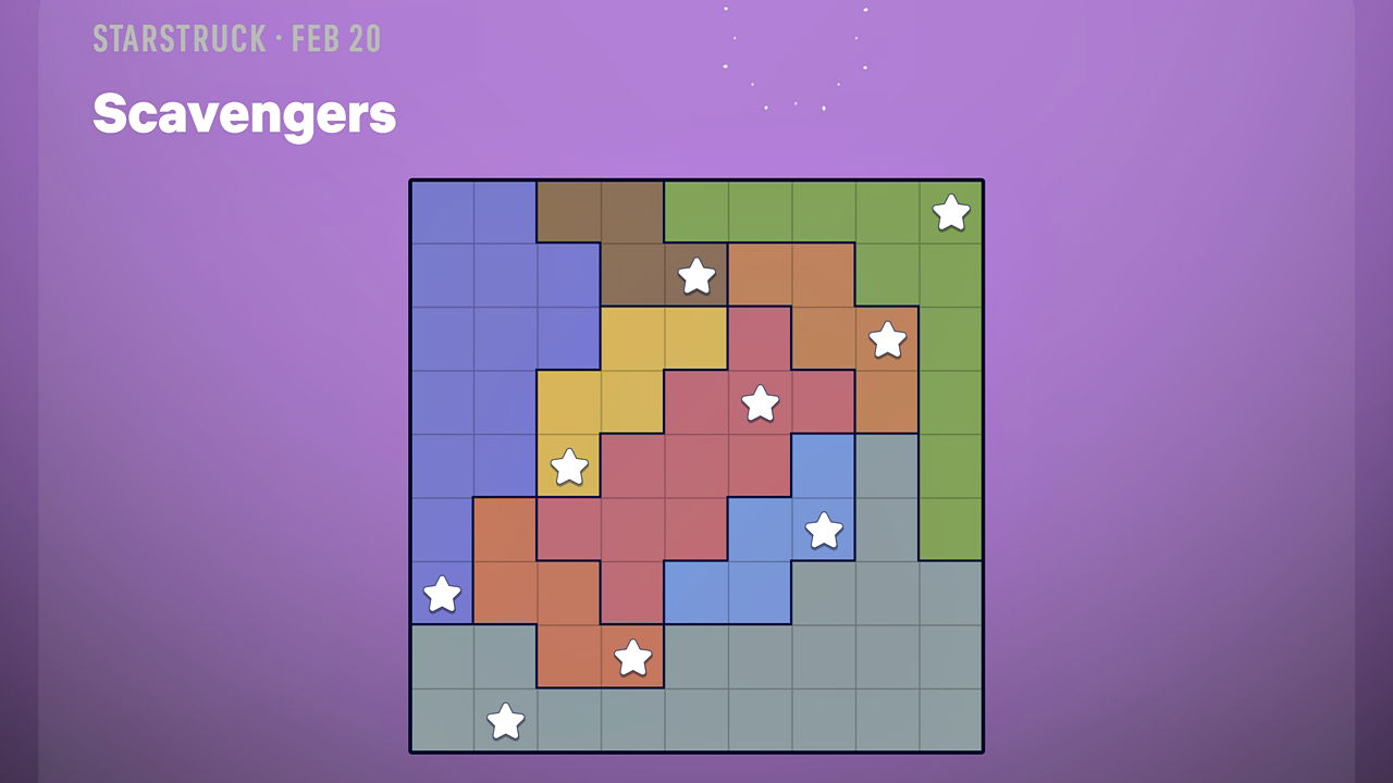 Я совершенно затянут в Starstruck! Это очень умная головоломка, где нужно размещать звезды на сетке. Задача заключается в том, чтобы убедиться, что в каждой строке, столбце и одном из этих цветных блоков была только одна звезда, но вот в чем загвоздка – звезды не могут касаться друг друга, даже по диагонали! Я попробовал сегодня легкую головоломку под названием ‘pqr’, и это была забавная маленькая задачка для ума. Затем я попытался решить сложную головоломку ‘Scavengers’, и вау, она действительно заставила меня подумать!