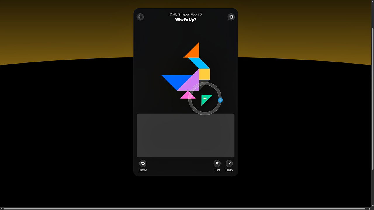 Головоломка ‘What’s Up?’ предлагает вам создать фигуру утки, используя детали танграма. Как только вы успешно завершите головоломку, появится сообщение.