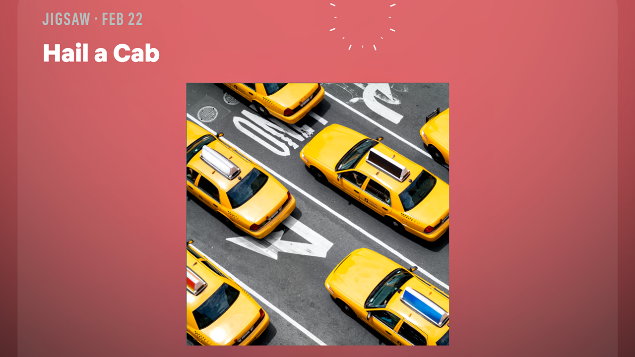 Эта недельная головоломка, под названием «Поймай такси», изображает оживленную улицу, заполненную желтыми такси. Как обычно для воскресной головоломки, она довольно сложная – схожие цвета затрудняют сборку!