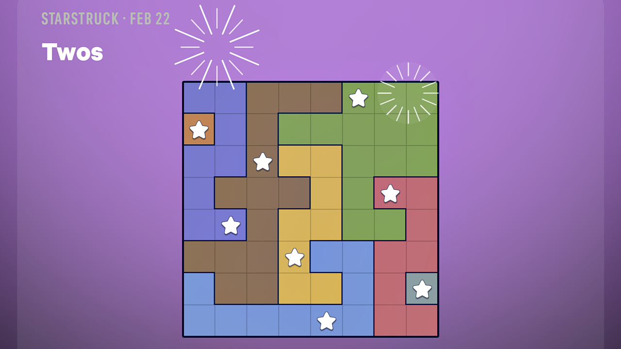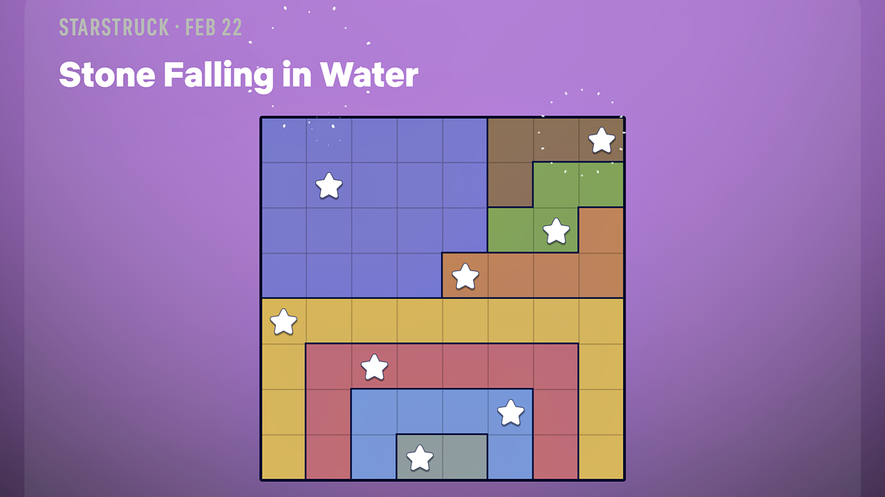 Головоломка Starstruck бросает вам вызов стратегически размещать звёзды на сетке. Правила просты: каждая строка, столбец и уникально окрашенная секция должны содержать ровно одну звезду, и ни две звезды не могут быть смежными — даже по диагонали. Головоломки на сегодня — ‘Twos’ (Easy) и ‘Stone Falling in Water’ (Hard), и обе предлагают типичный воскресный уровень сложности.