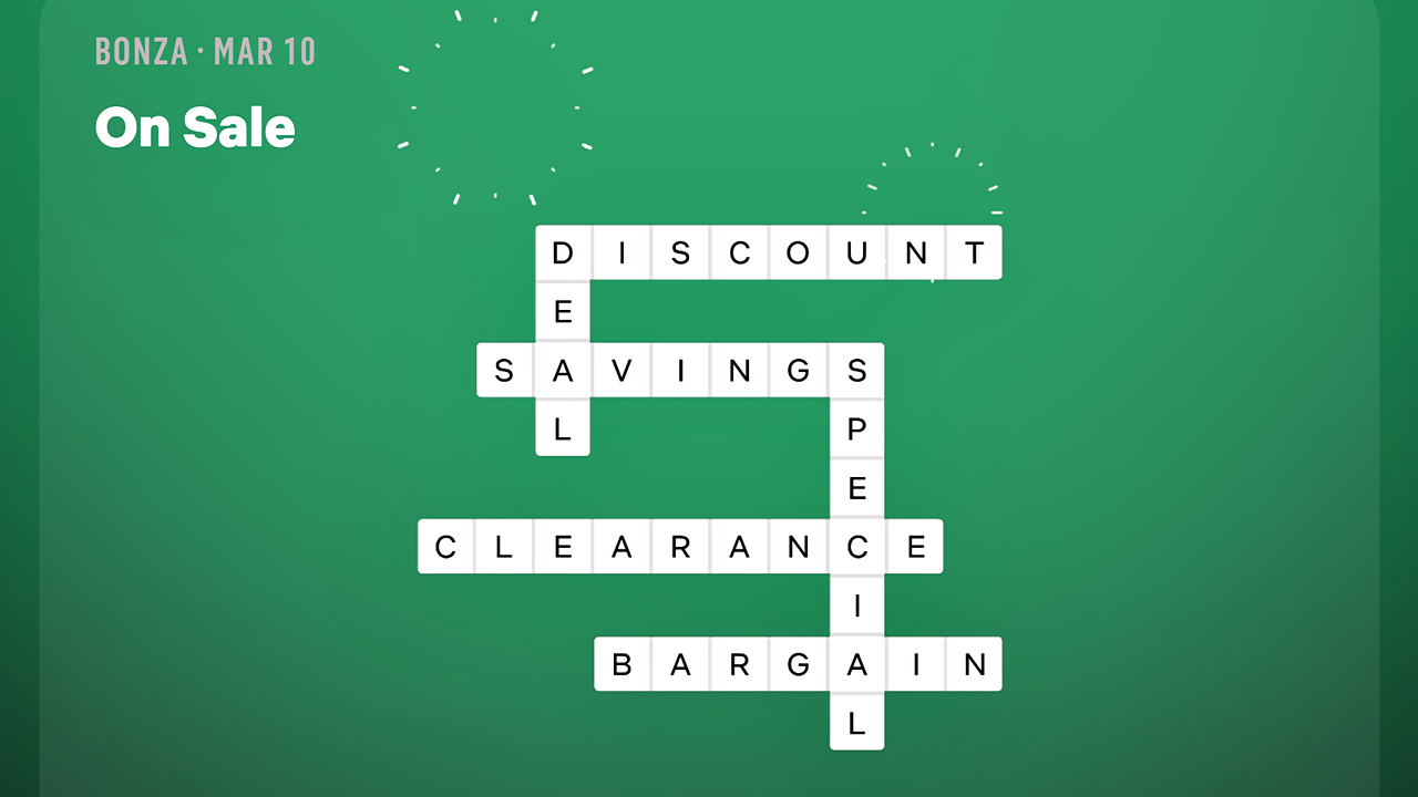 Подсказка для головоломки Bonza — «On Sale», что подразумевает слова, связанные со скидками и покупками. Соедините плитки, чтобы узнать ответ.