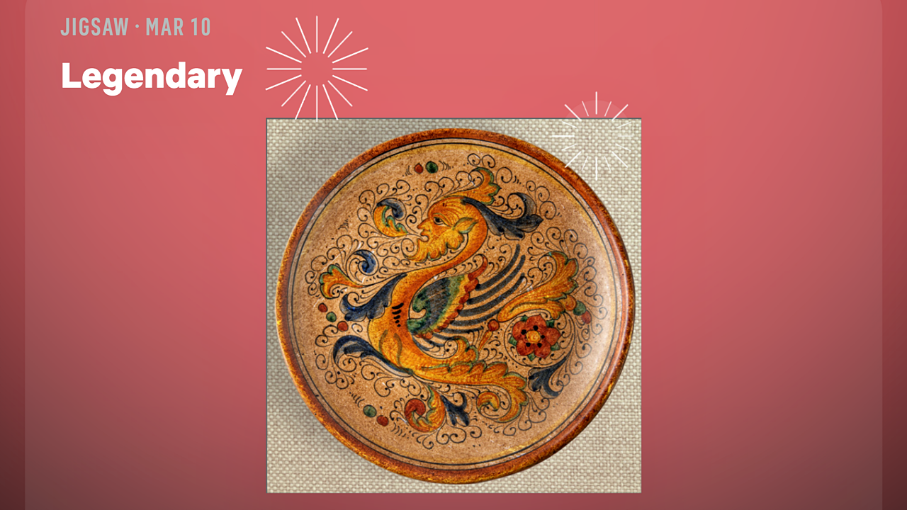 Эта недельная головоломка, названная «Legendary», демонстрирует красиво украшенную керамическую тарелку. Центральный дизайн тарелки изображает мифическое существо, напоминающее либо золотого феникса, либо грифона.