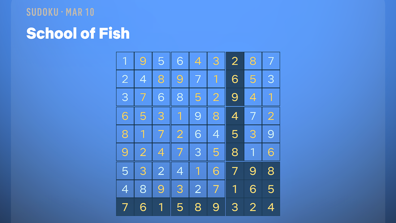 Сегодняшние головоломки Судоку – «Школа рыб» (Легкий), «Книжные полки» (Средний) и «Большой серфинг» (Сложный) – все стандартного размера 9×9. Если вы застряли в строке или секции, завершенные головоломки в галерее выше могут предложить некоторую помощь!