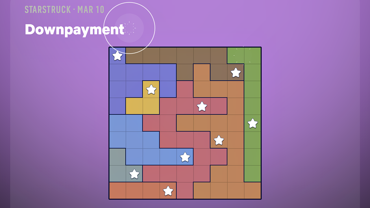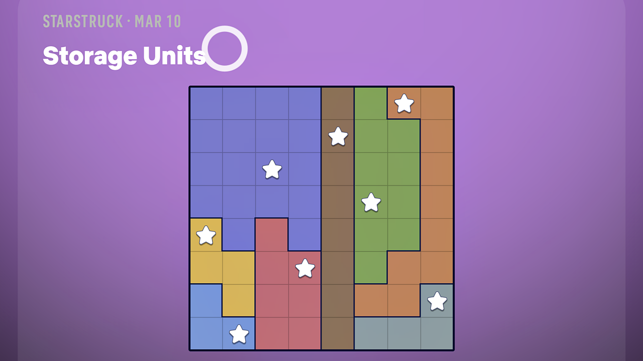 Starstruck предлагает вам заполнить сетку звёздами. Цель состоит в том, чтобы разместить по одной звезде в каждой строке, столбце и цветной области, убедившись, что ни одна звезда не находится рядом с другой – даже по диагонали. Головоломки, доступные сегодня, называются ‘Storage Units’ (более простая версия) и ‘Downpayment’ (более сложная головоломка).