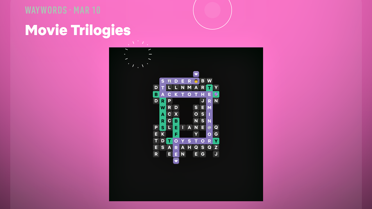 Тема сегодняшней головоломки Waywords — «Кинотрилогии». Вам нужно будет найти путь через популярные киносерии, следуя буквам сверху вниз, чтобы раскрыть ответ.