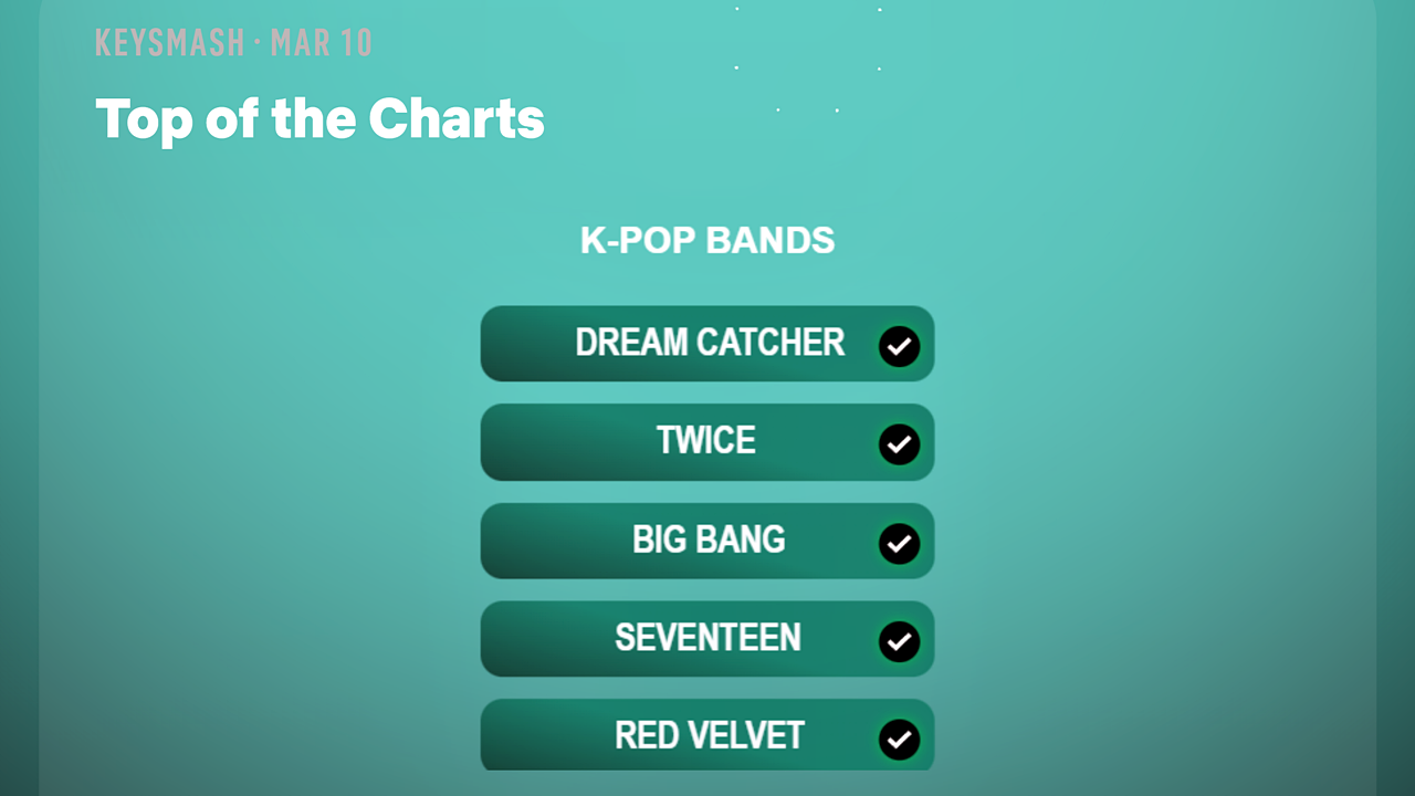 Ежедневная головоломка Keysmash с подсказкой «Вершина чартов» предполагает, что ответ связан с популярными K-Pop группами. Завершите следующее слово, добавив недостающие гласные: